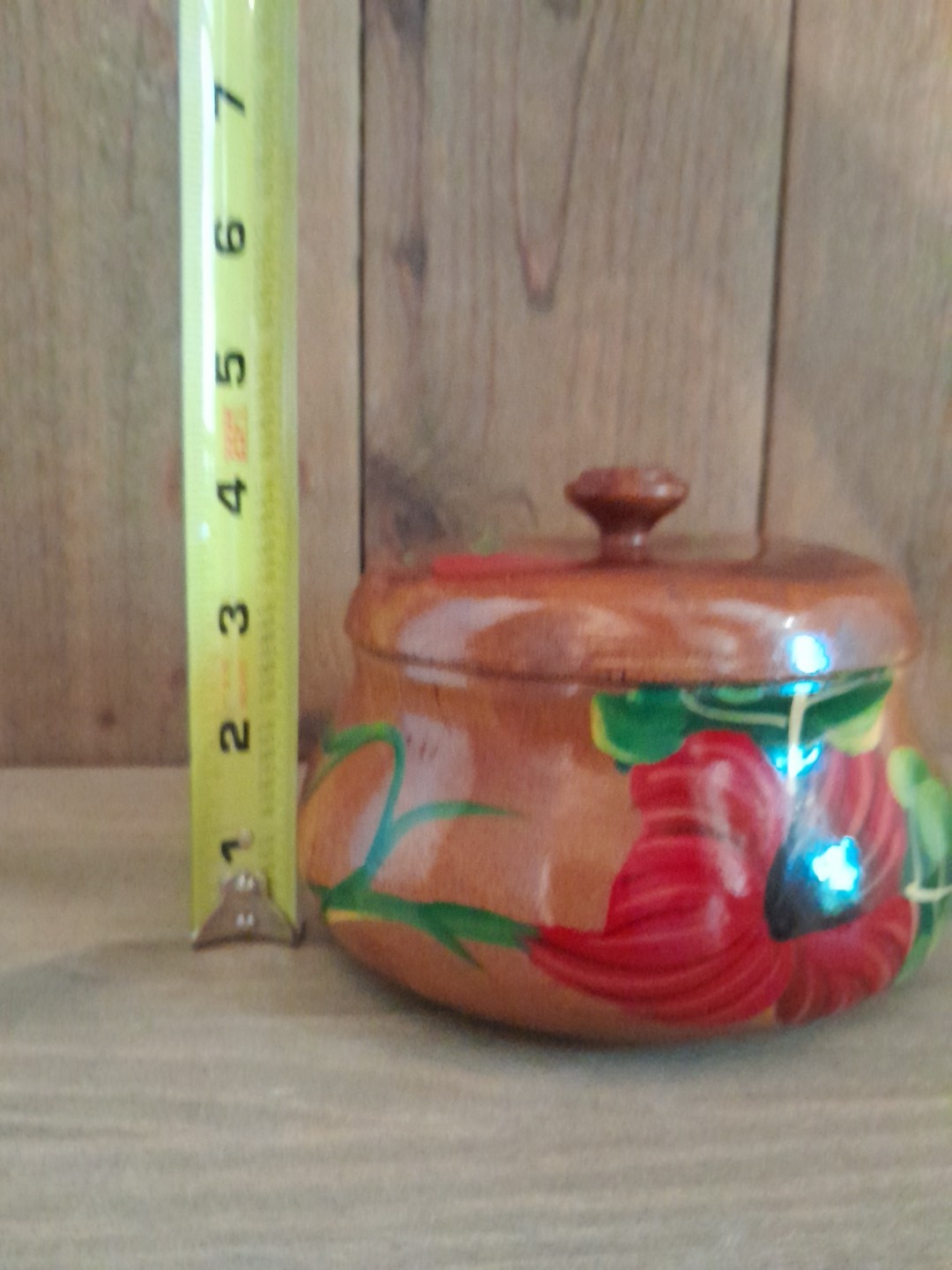 как выглядит Vintage Hand Turned Wood Floral Lidded Bowl Glazed Hand Painted Folk Art 4" x 6" фото