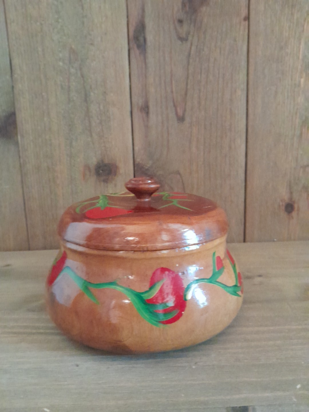 Vintage Hand Turned Wood Floral Lidded Bowl Glazed Hand Painted Folk Art 4 x 6
