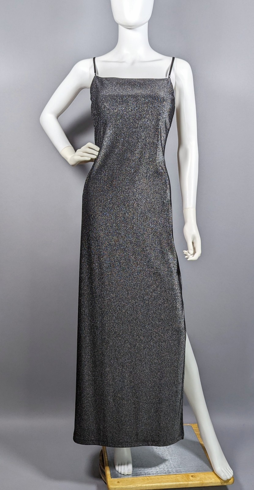 Vtg 90s Y2K City Triangles Metallic Silver Sparkle Maxi Dress Prom USA Made Sz L