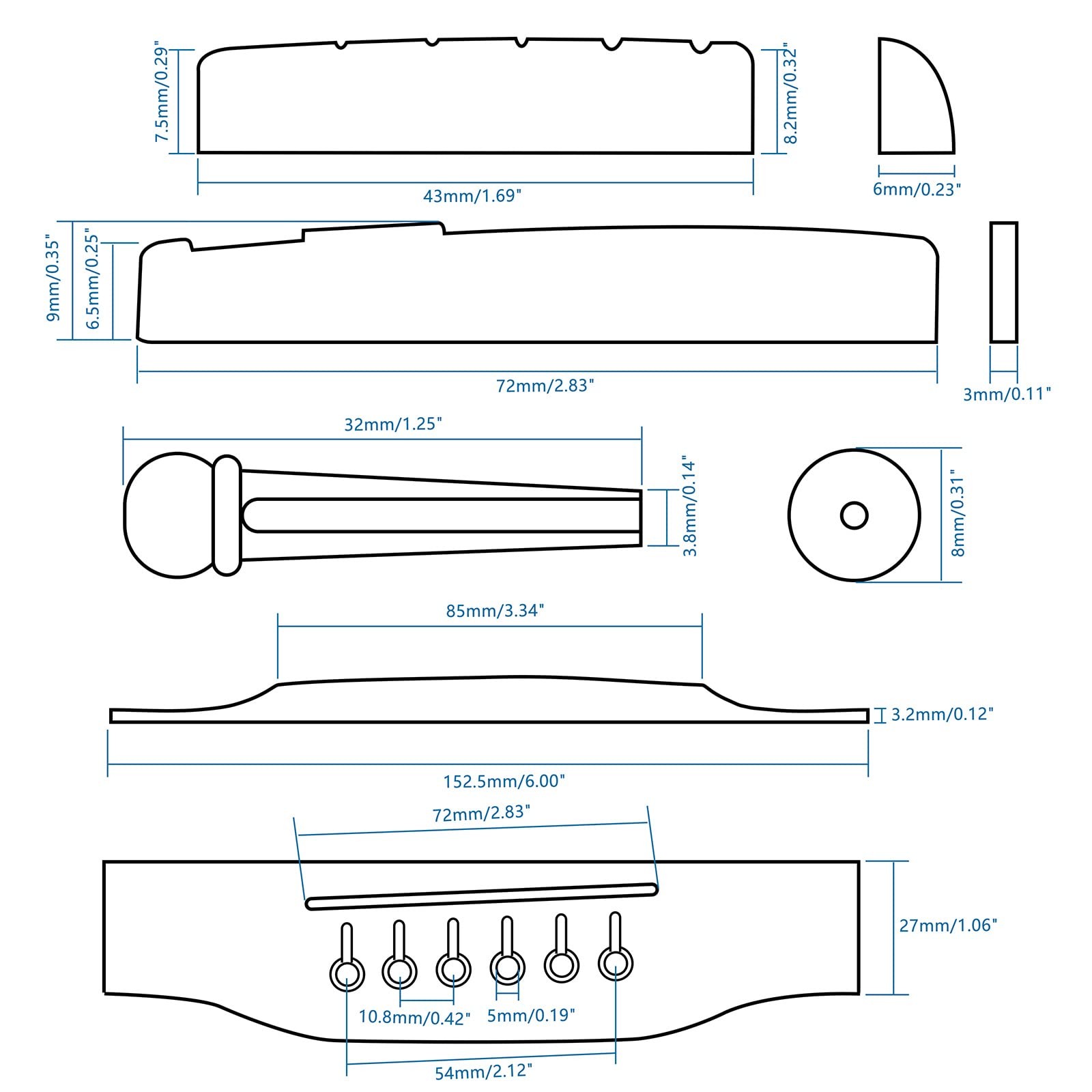 6 String Rosewood Acoustic Guitar Bridge Saddle Nut Pins Set with Six Black
