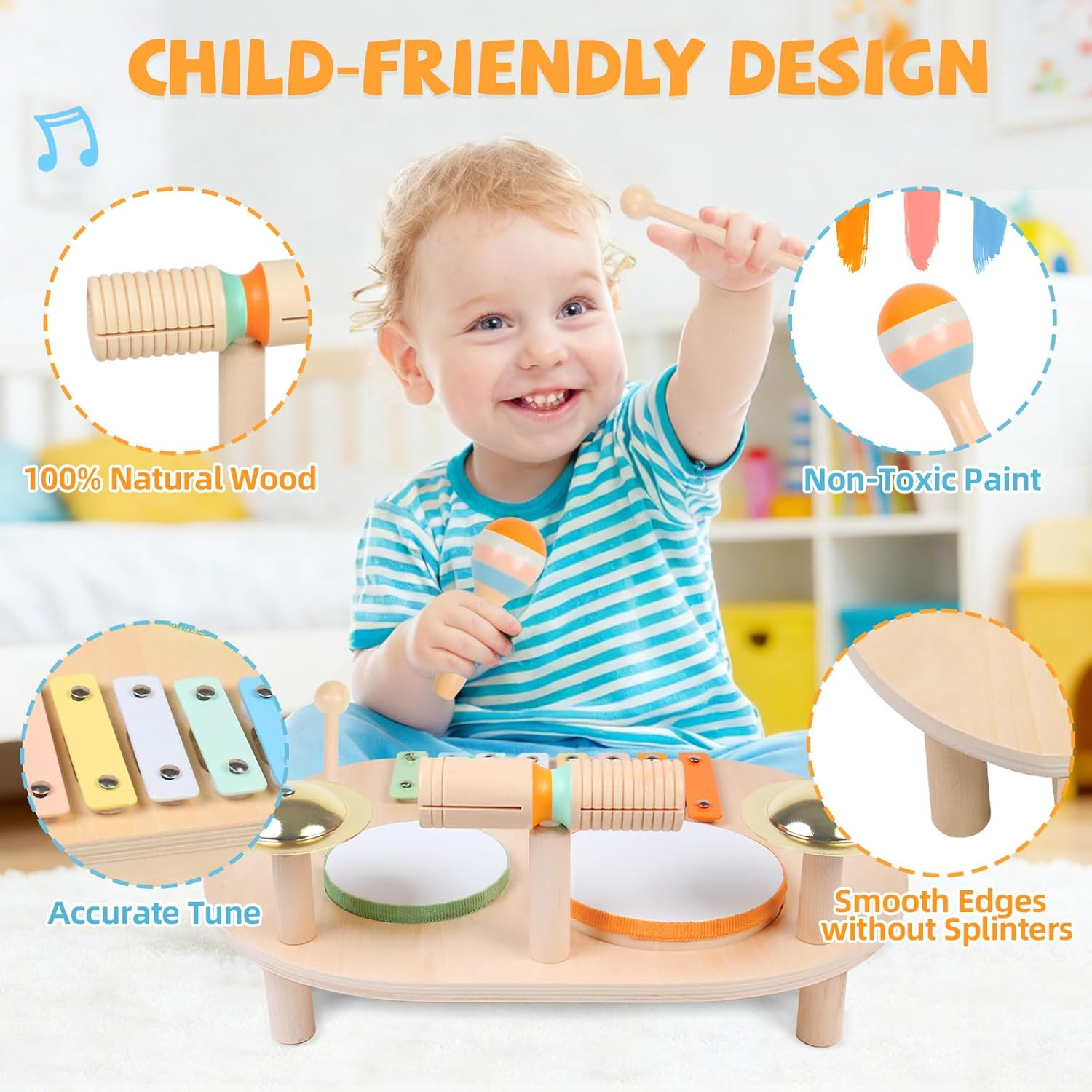 Toddler Drum Set for Kids, Wooden Montessori Toys for 2 Year Old, Baby Musical I