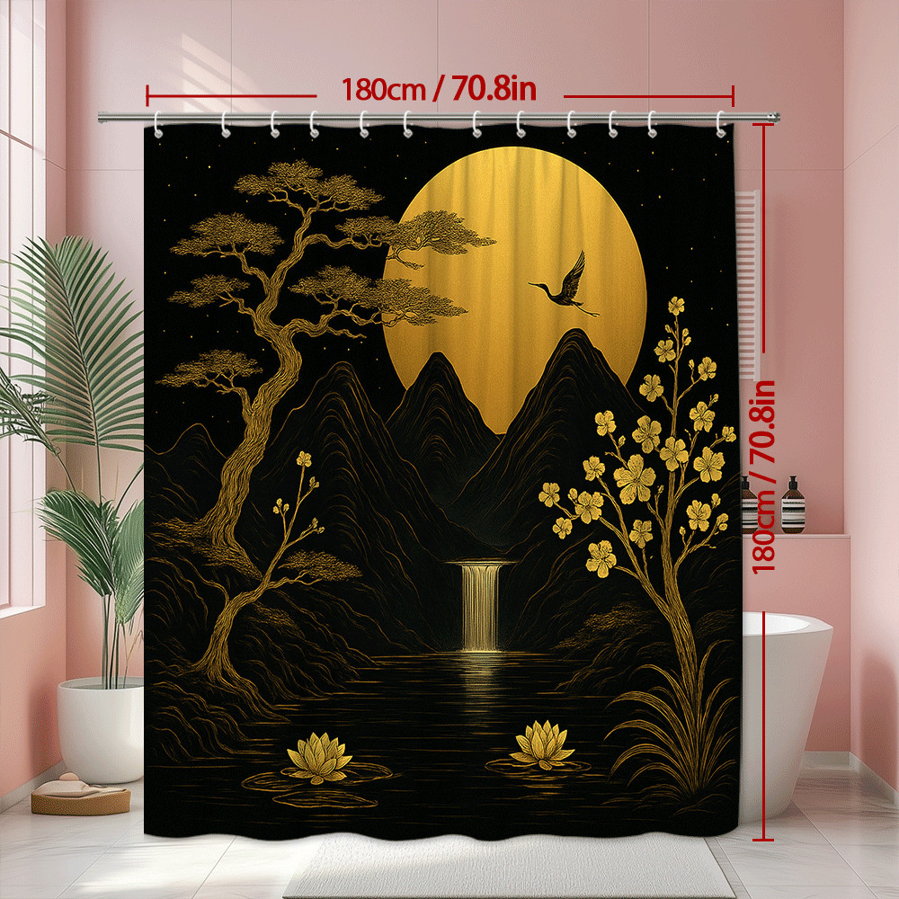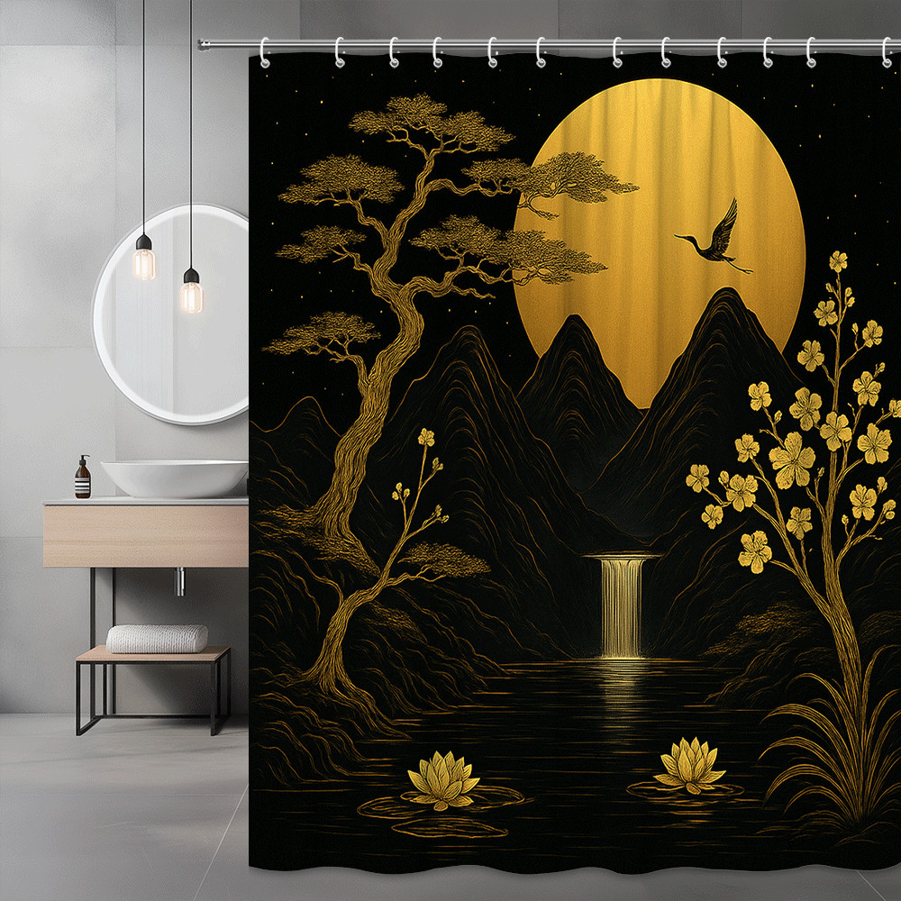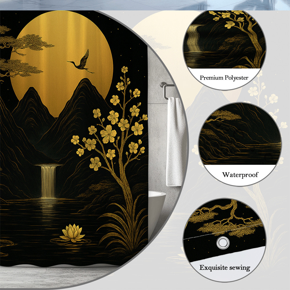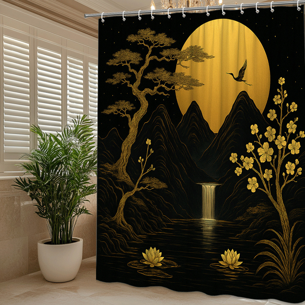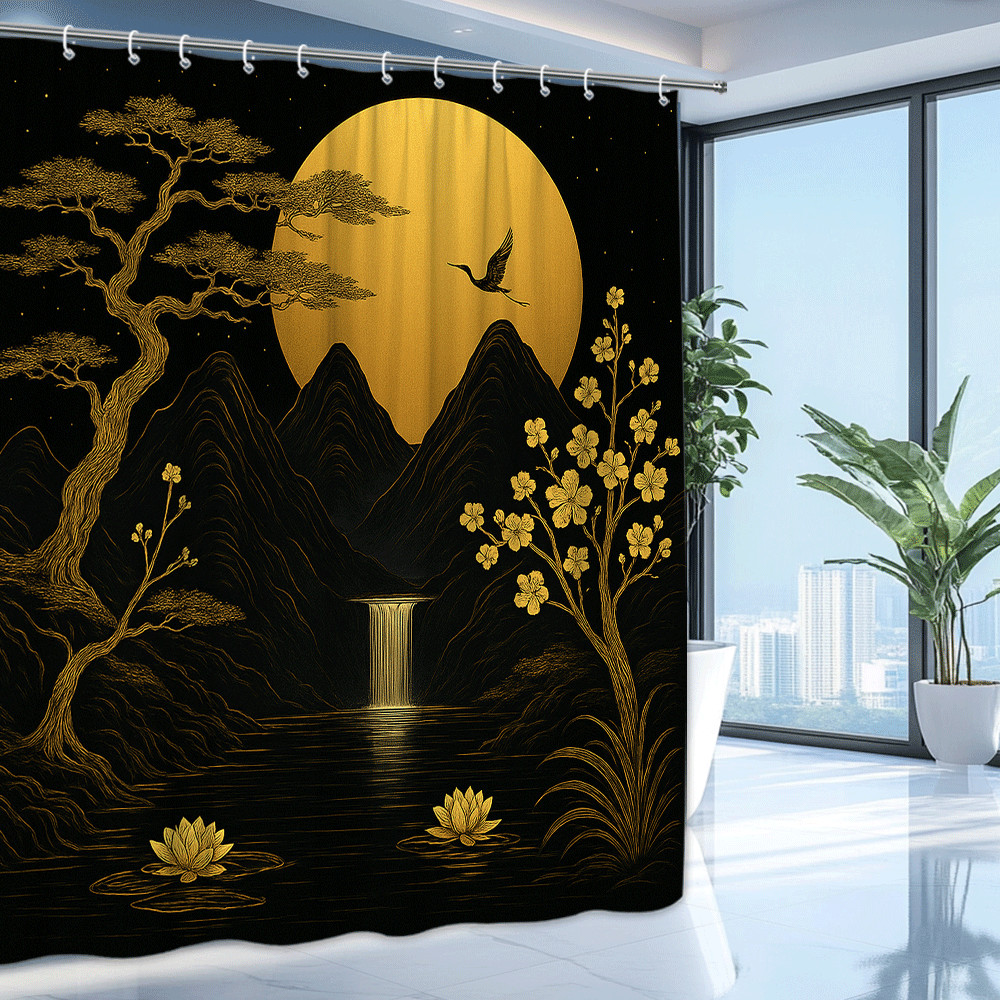Elegant Gold and Black Shower Curtain with Nature Scene