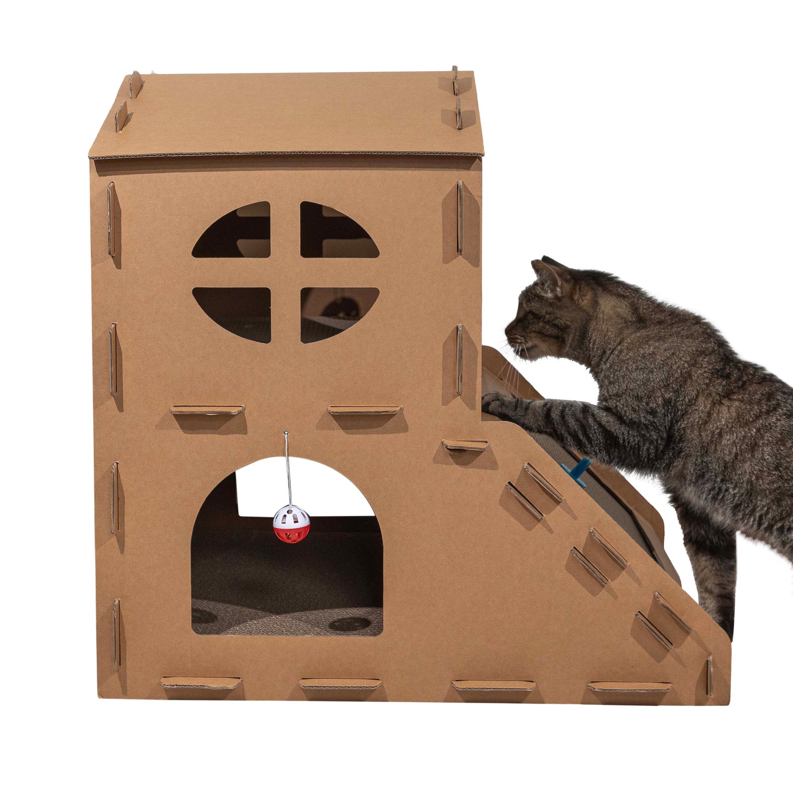 Multi-Level Cardboard Cat House with Catnip and Play Toy with Feather Toy