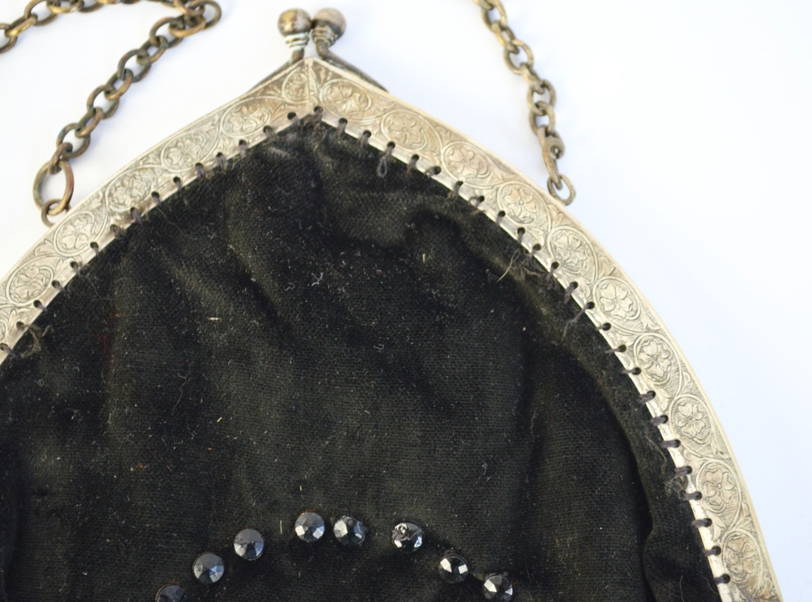 Vintage Antique Black Velvet Jeweled Chain Handle Clutch Bag
