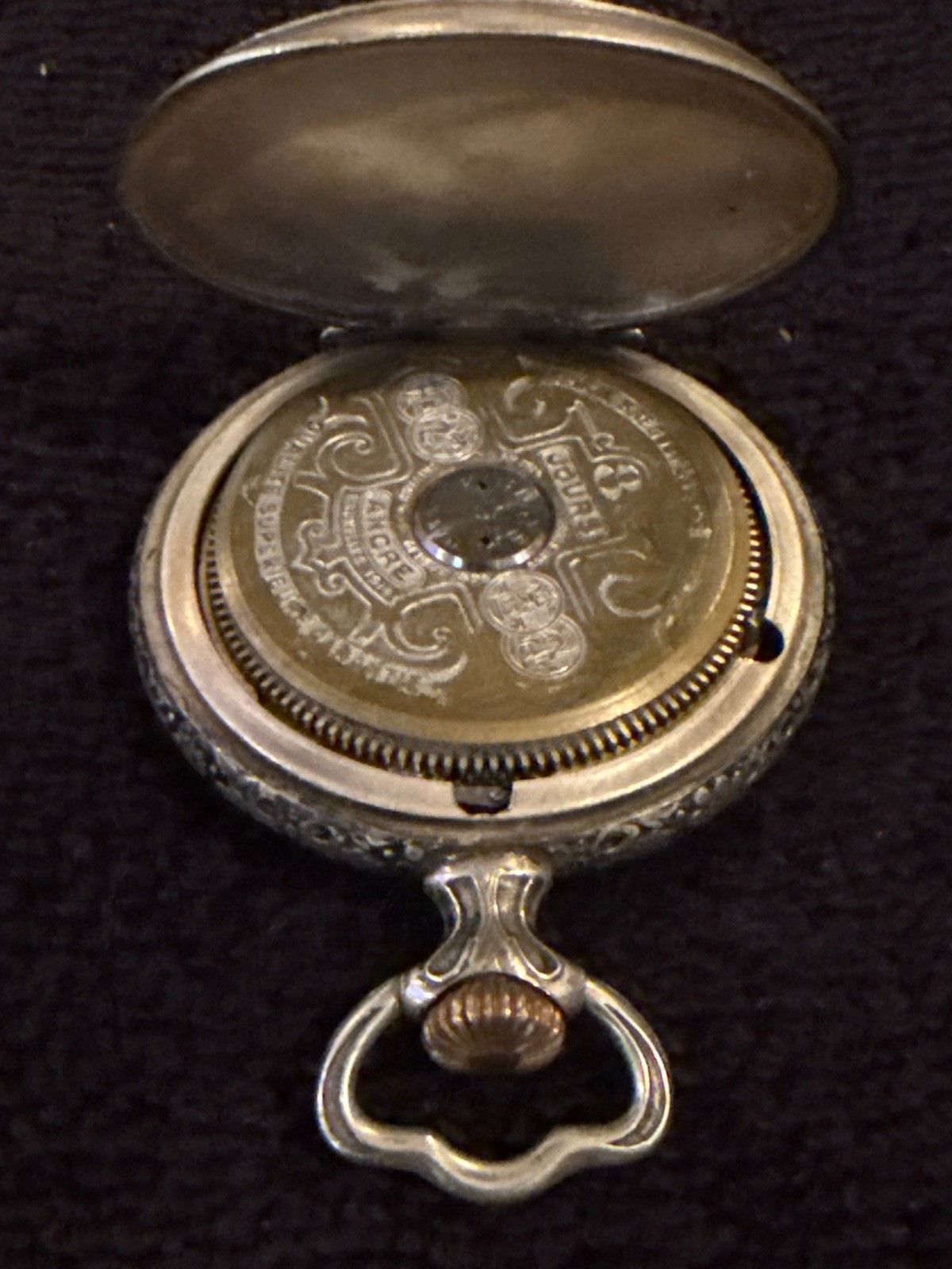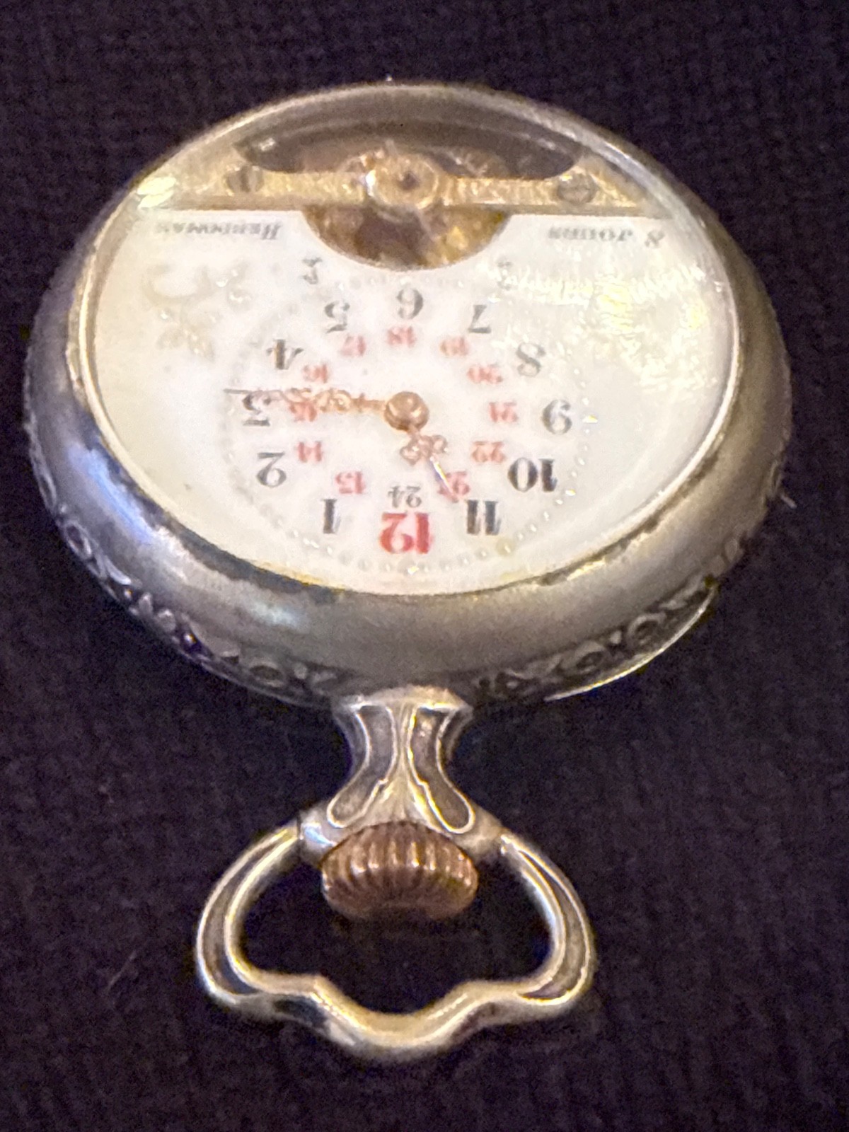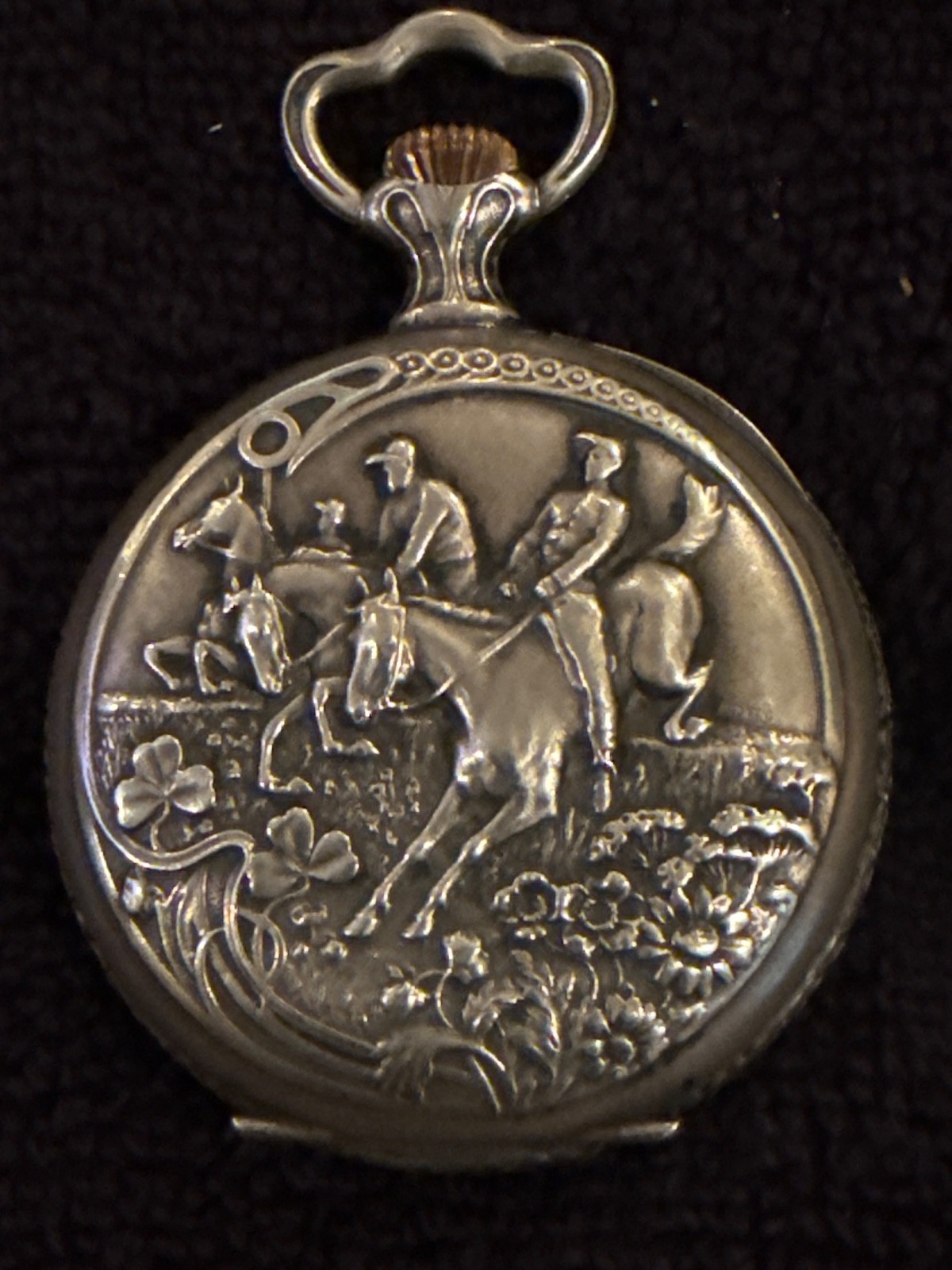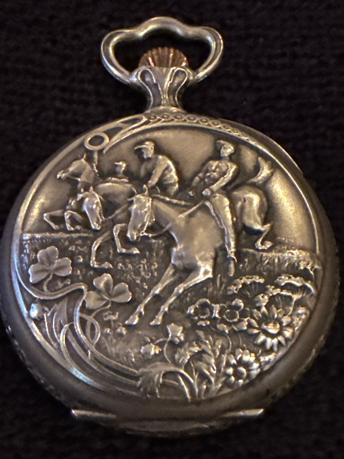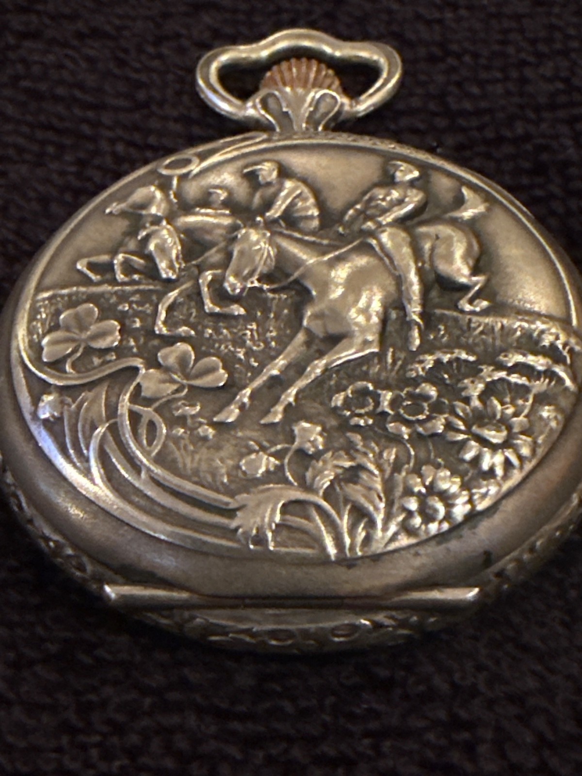 как выглядит RARE-Hebdomas 8 Days Pocket Watch / Beautiful Hunting Scene 1910 Runs Great фото