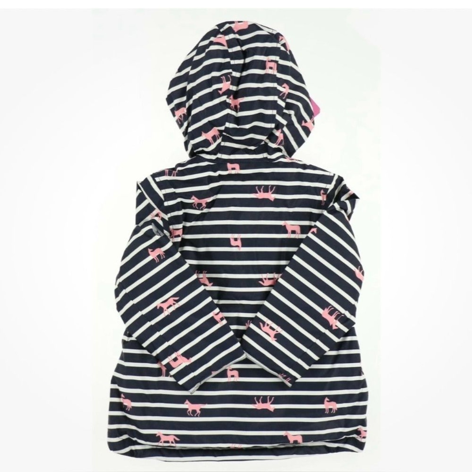 Joules Girl s Waterproof Raincoat Jacket Navy Stripe with Pink Horses. Size 5y