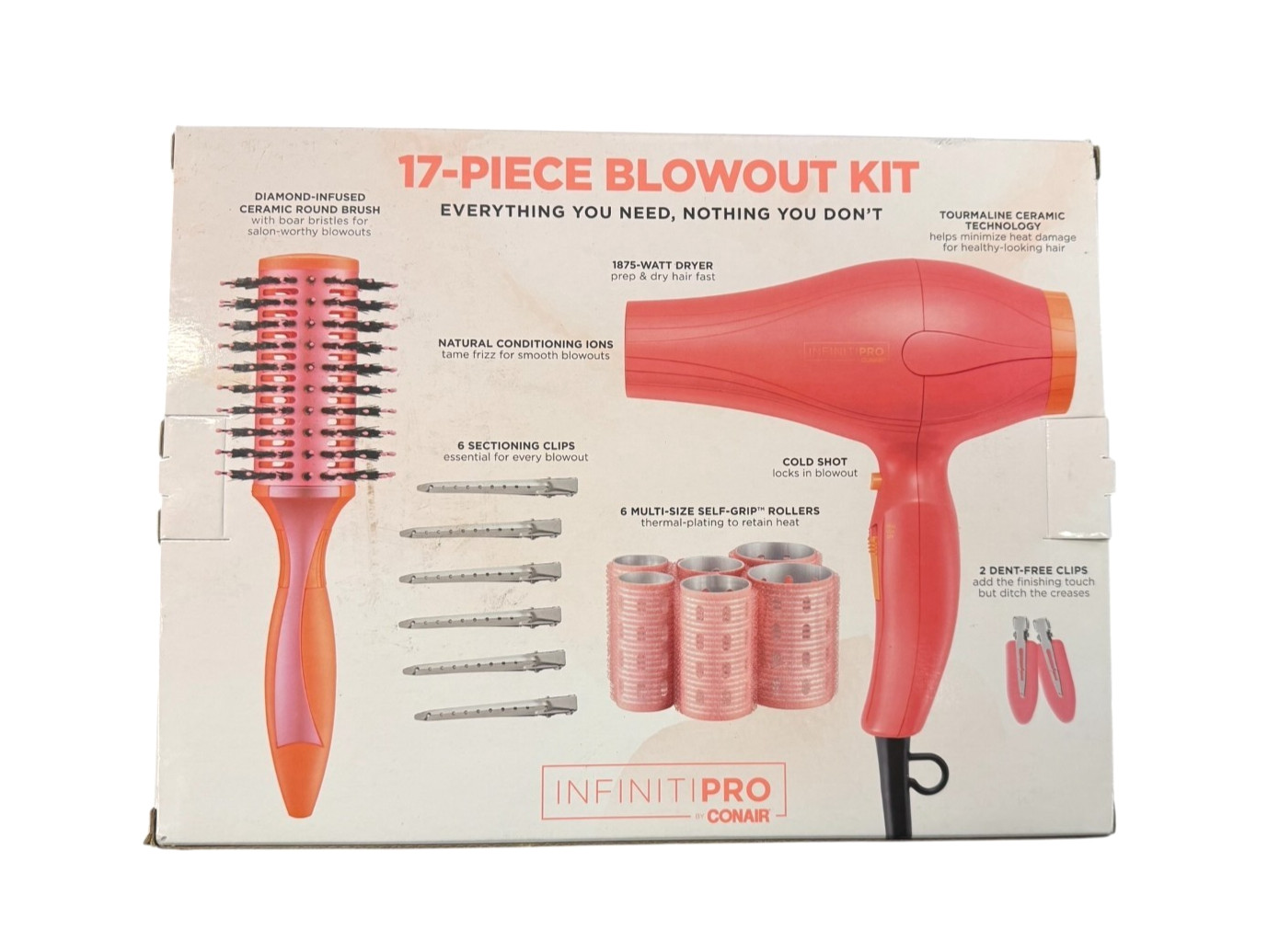 InfinitiPRO by Conair 17-Piece Blowout Kit Pink Dryer, Rollers Brush NEW