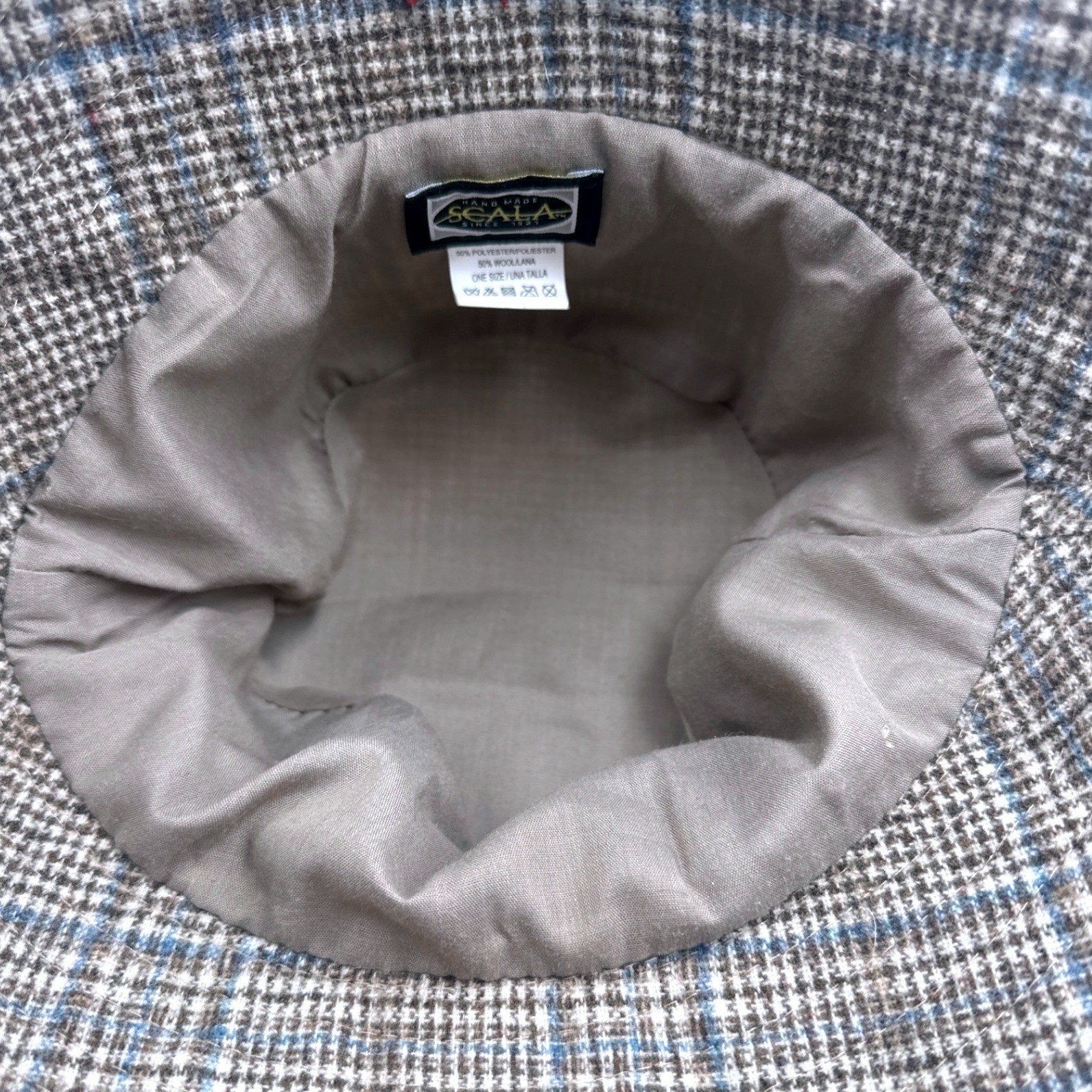 Vintage Scala Brown Tan Blue Plaid Bucket 21 Hat Wool Blend One Size 1990's