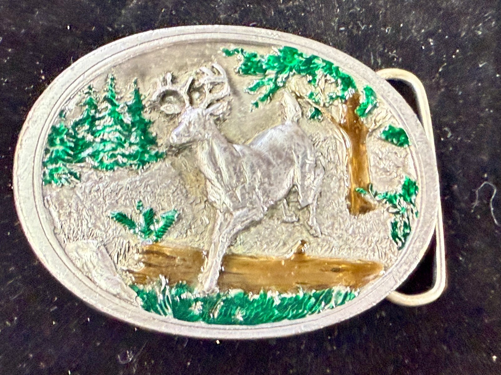 Running Jumping Deer Over the Log Wildlife Hunting Vintage 1986 C J Belt Buckle