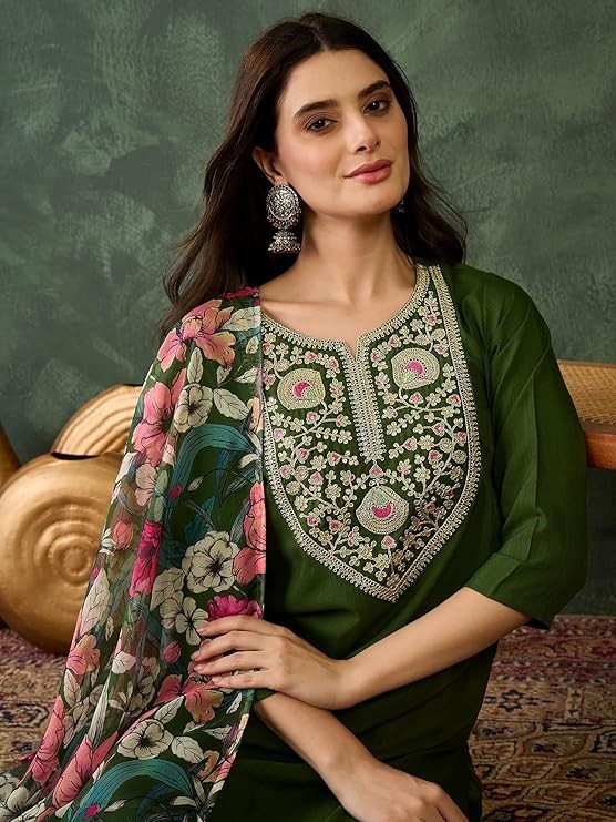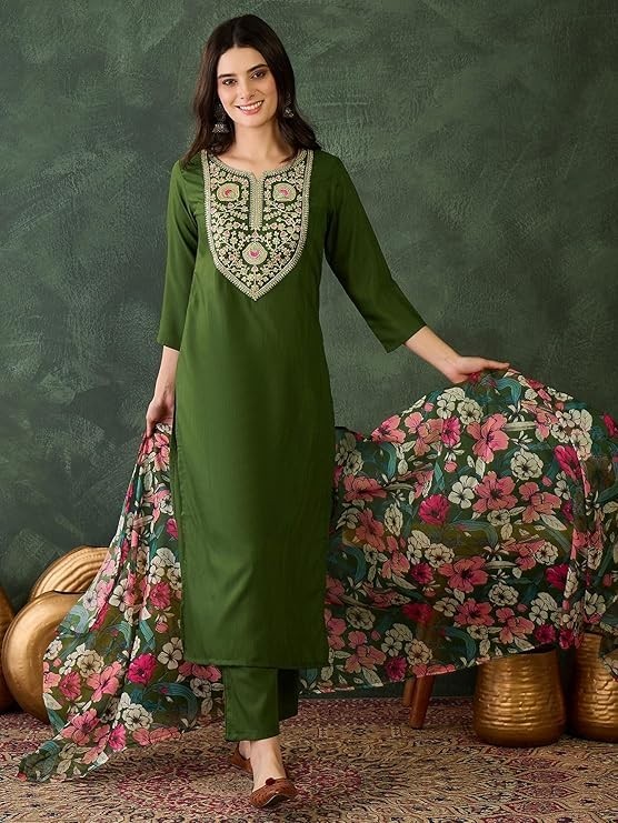 как выглядит Rayon Embroidered Straight Kurta with Pant and Dupatta Sets фото