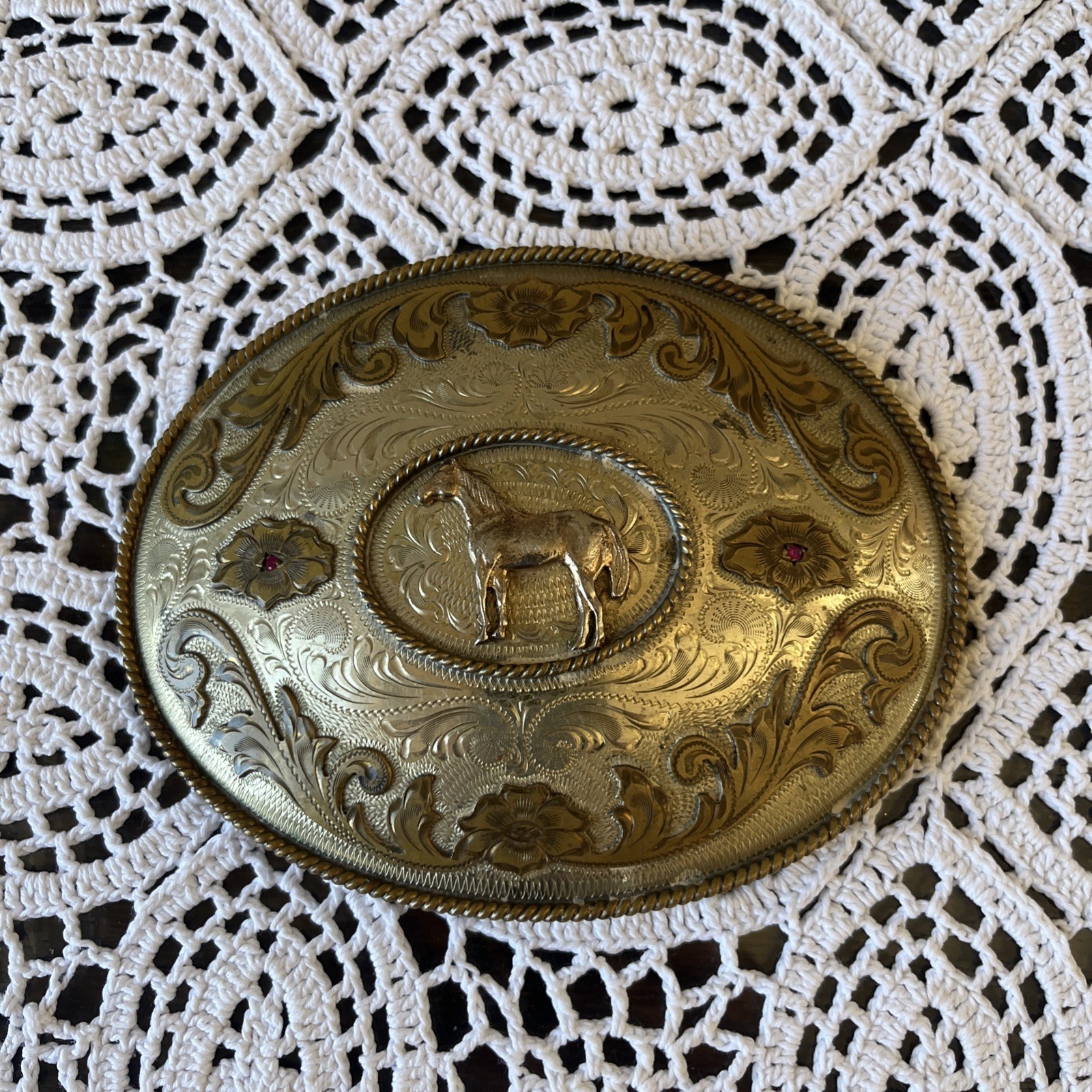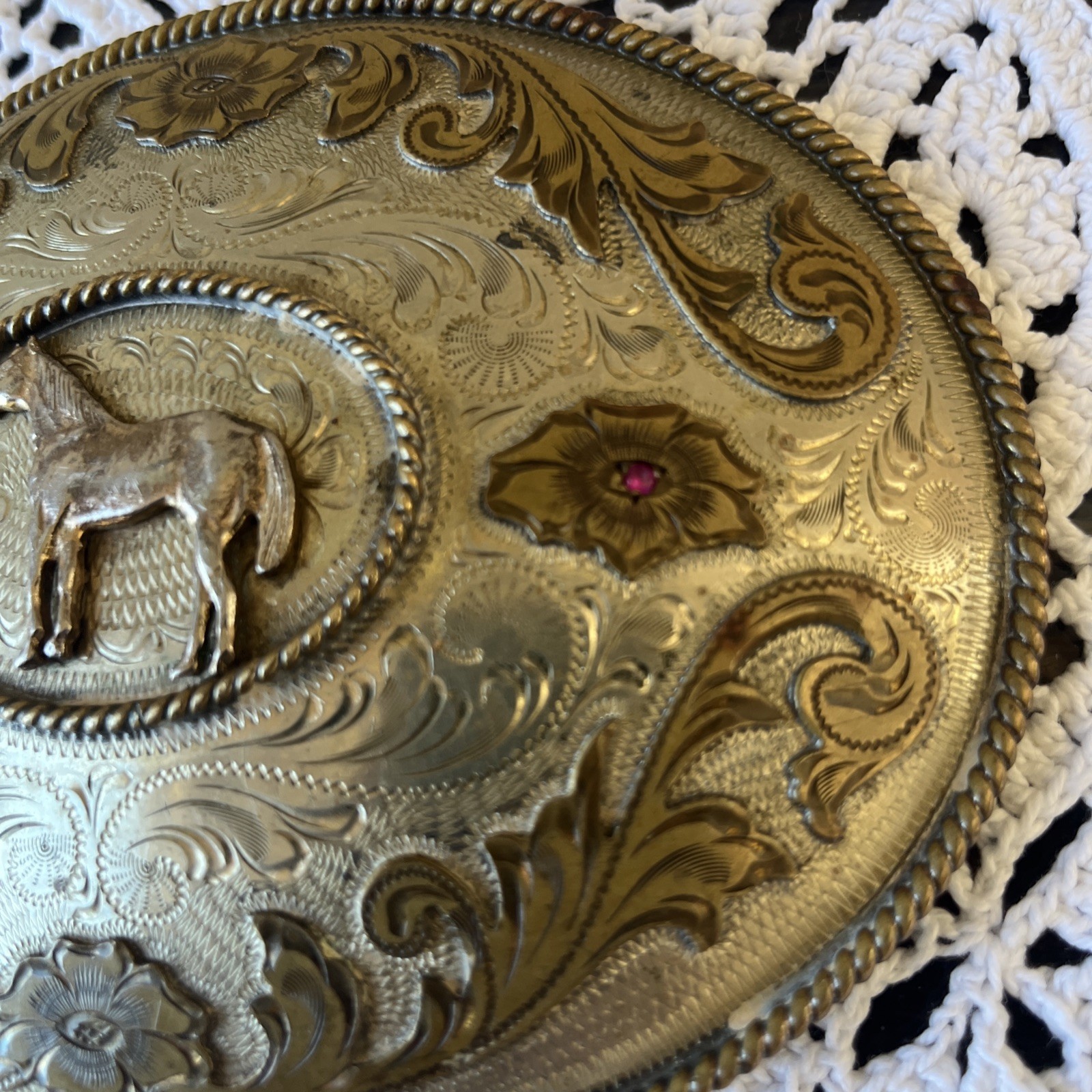 Vintage HUGE 6 Standing Horse Alpaca Mexico Belt Buckle Floral Pink Gemstones