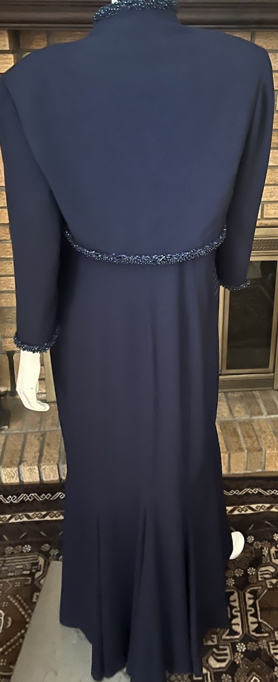 как выглядит Daymor Couture Navy Crepe Satin Beaded Gown With Jacket Size 18/20 фото