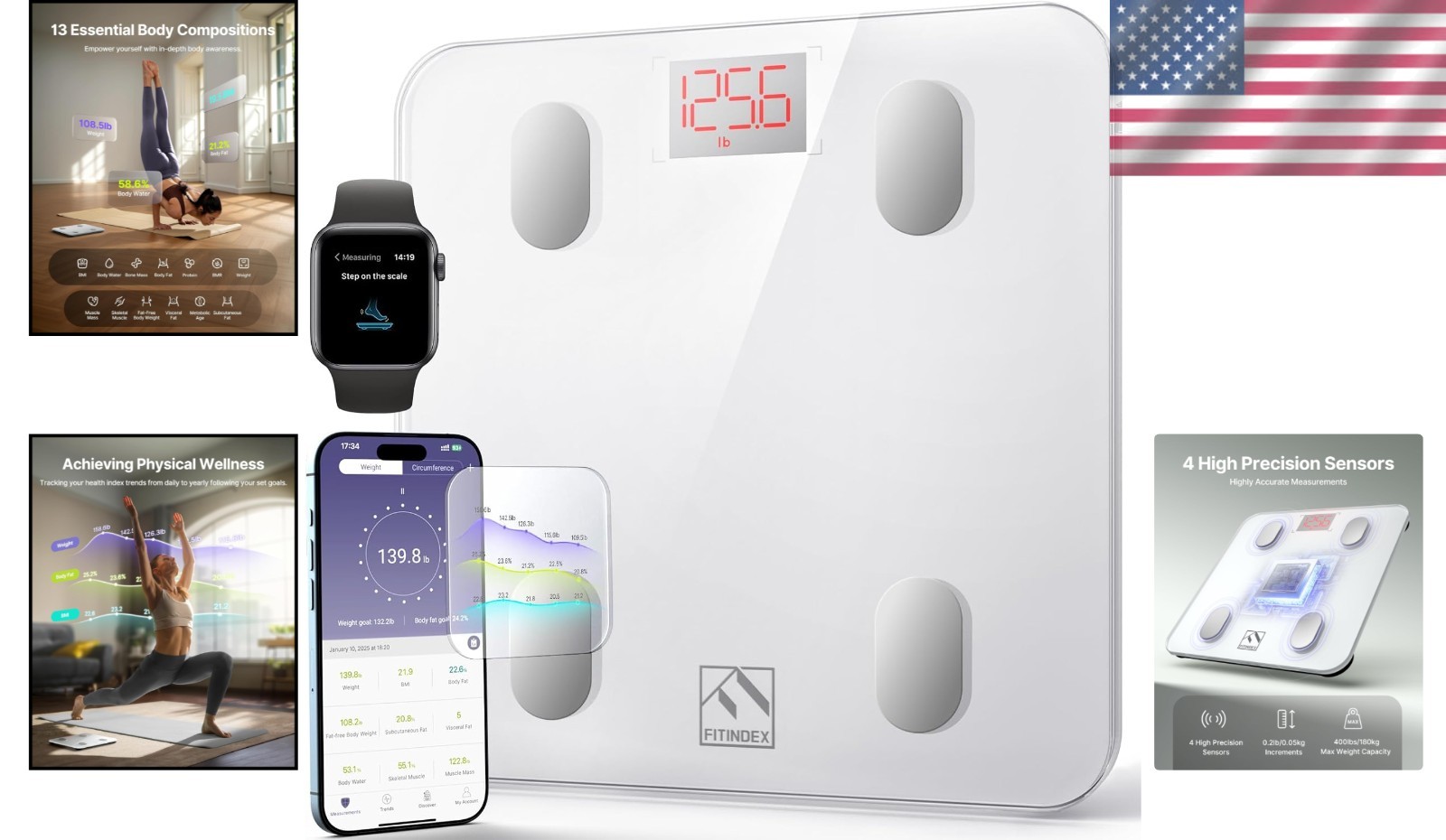 Fitindex Smart Scale: Bluetooth Body Composition Analyzer, 400lb Capacity, White