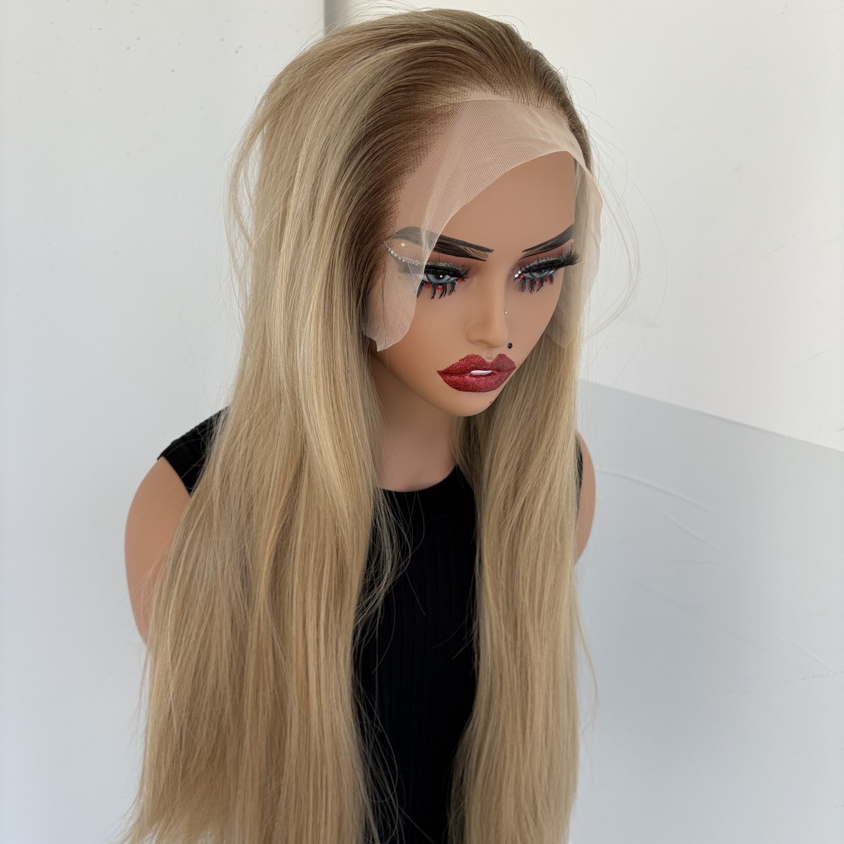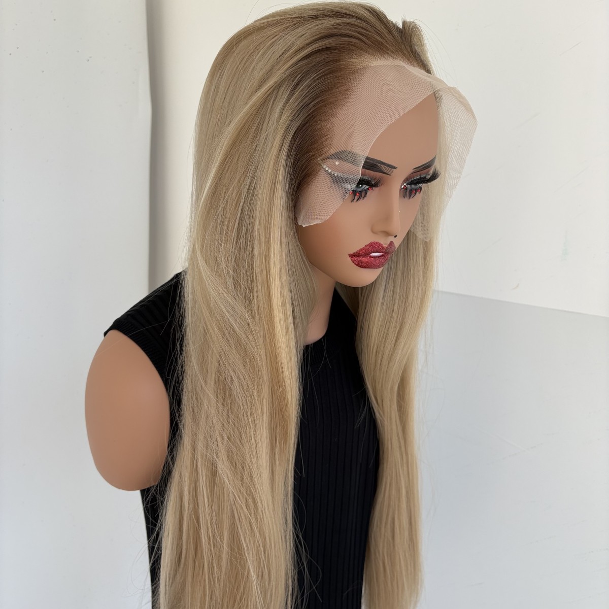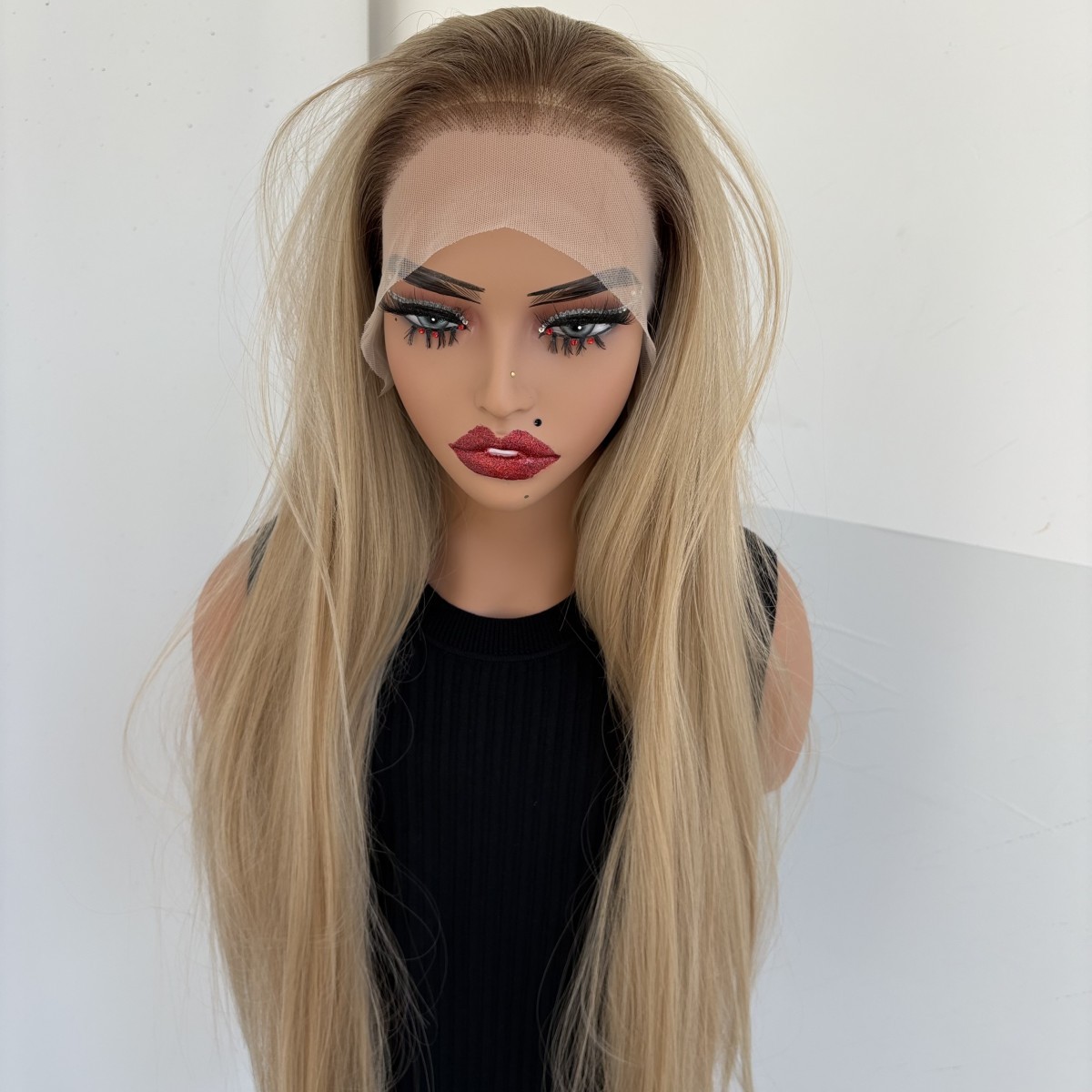 Long Straight Heat Resistant Hair Lace Front Wig Ombre Blonde Pre Plucked