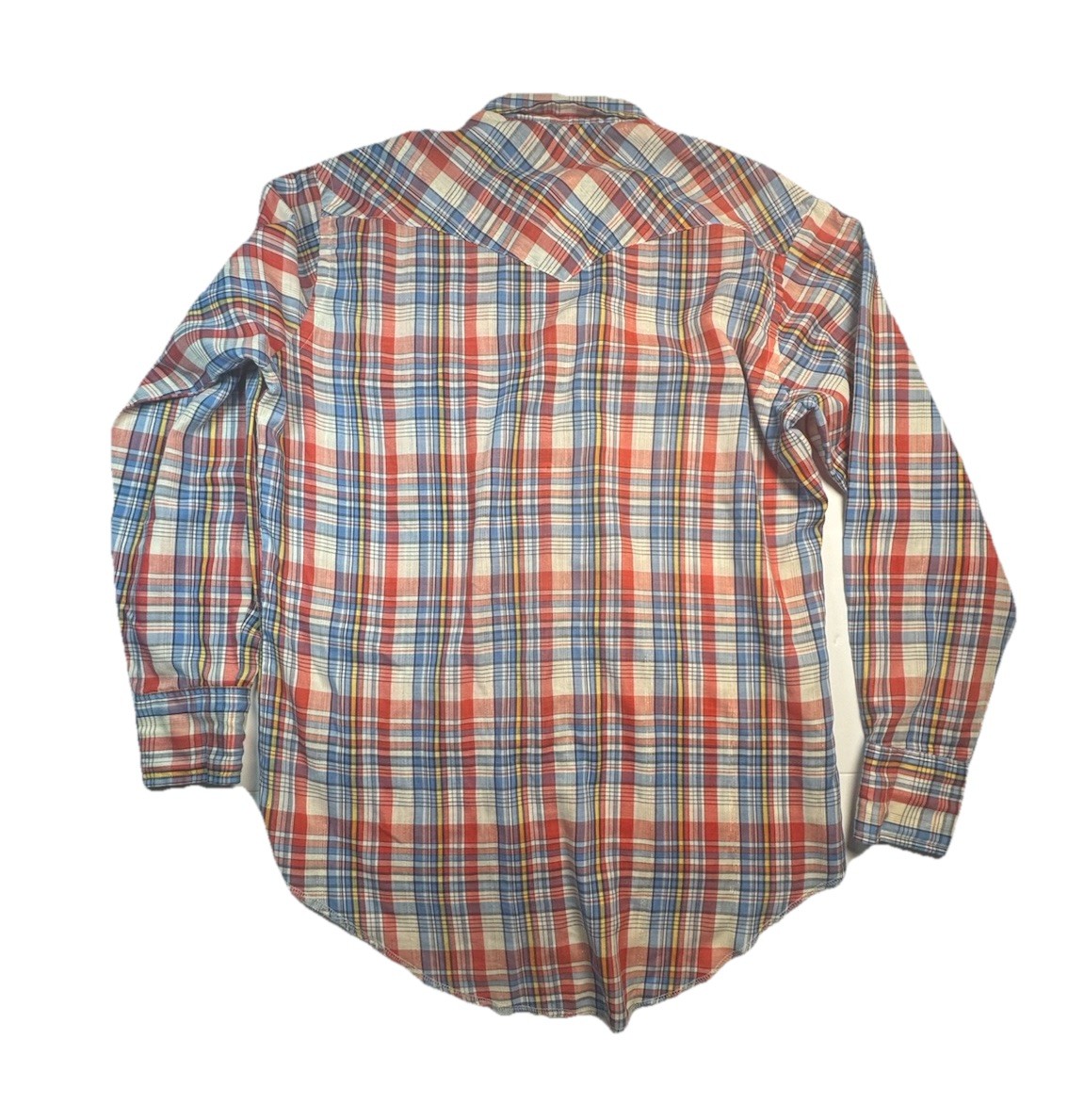VTG 70s Wrangler Pearl Snap Western Shirt Mens USA Made Long Tail Plaid 16.5 34