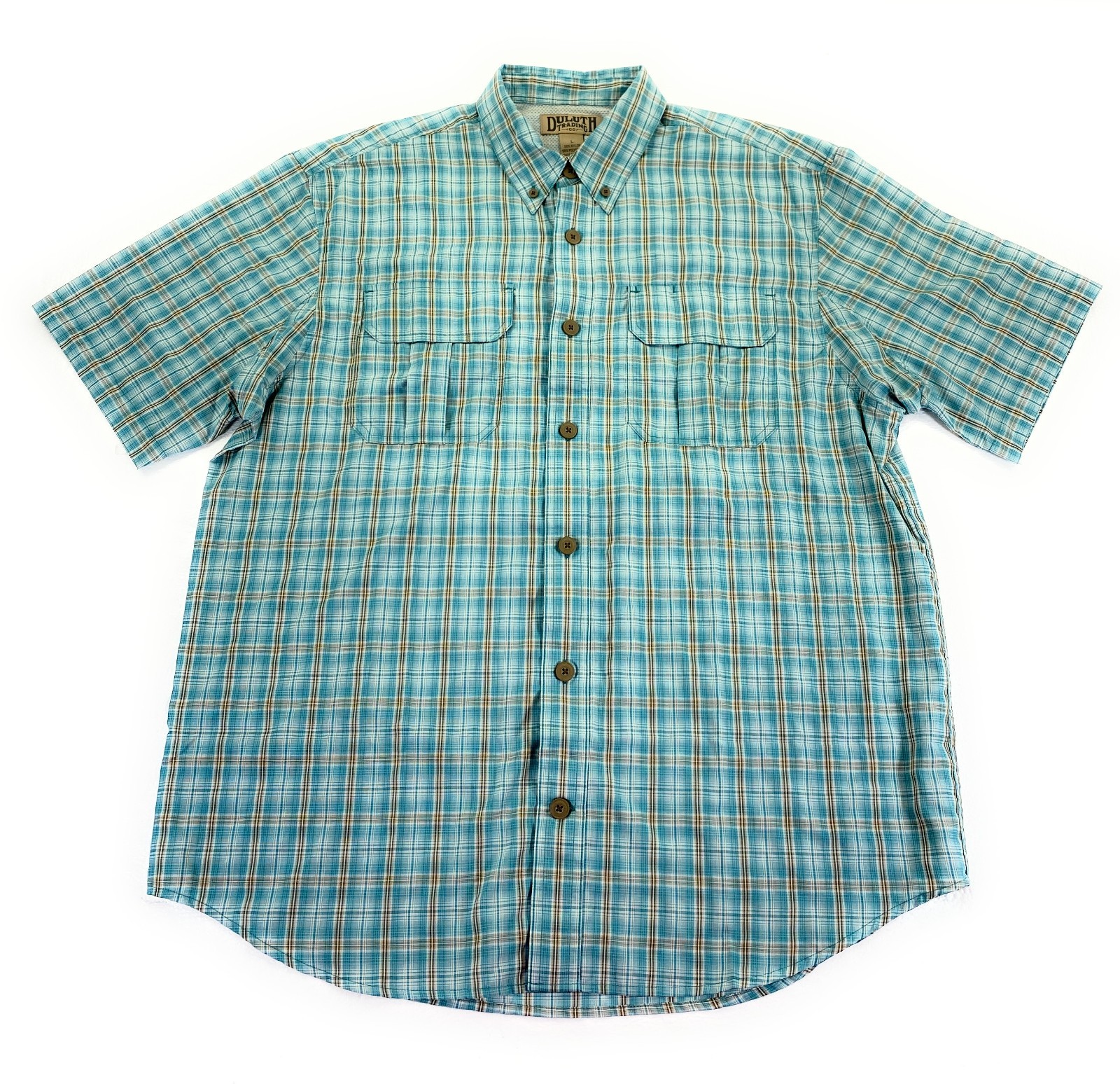 Duluth Men's Button Down Short Sleeve Vented Pockets Blue Check Shirt Large