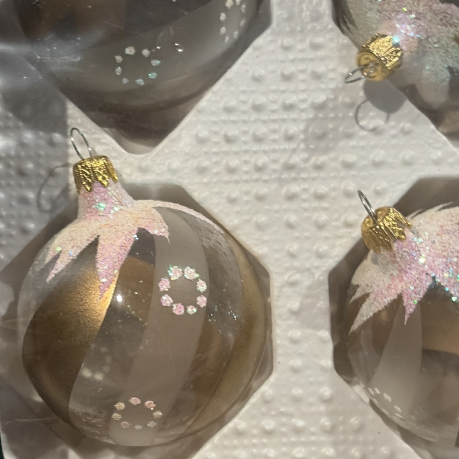 как выглядит Bradford Hand Decorated Glass Bauble Set Floral Christmas Ornaments Gold white 4 фото