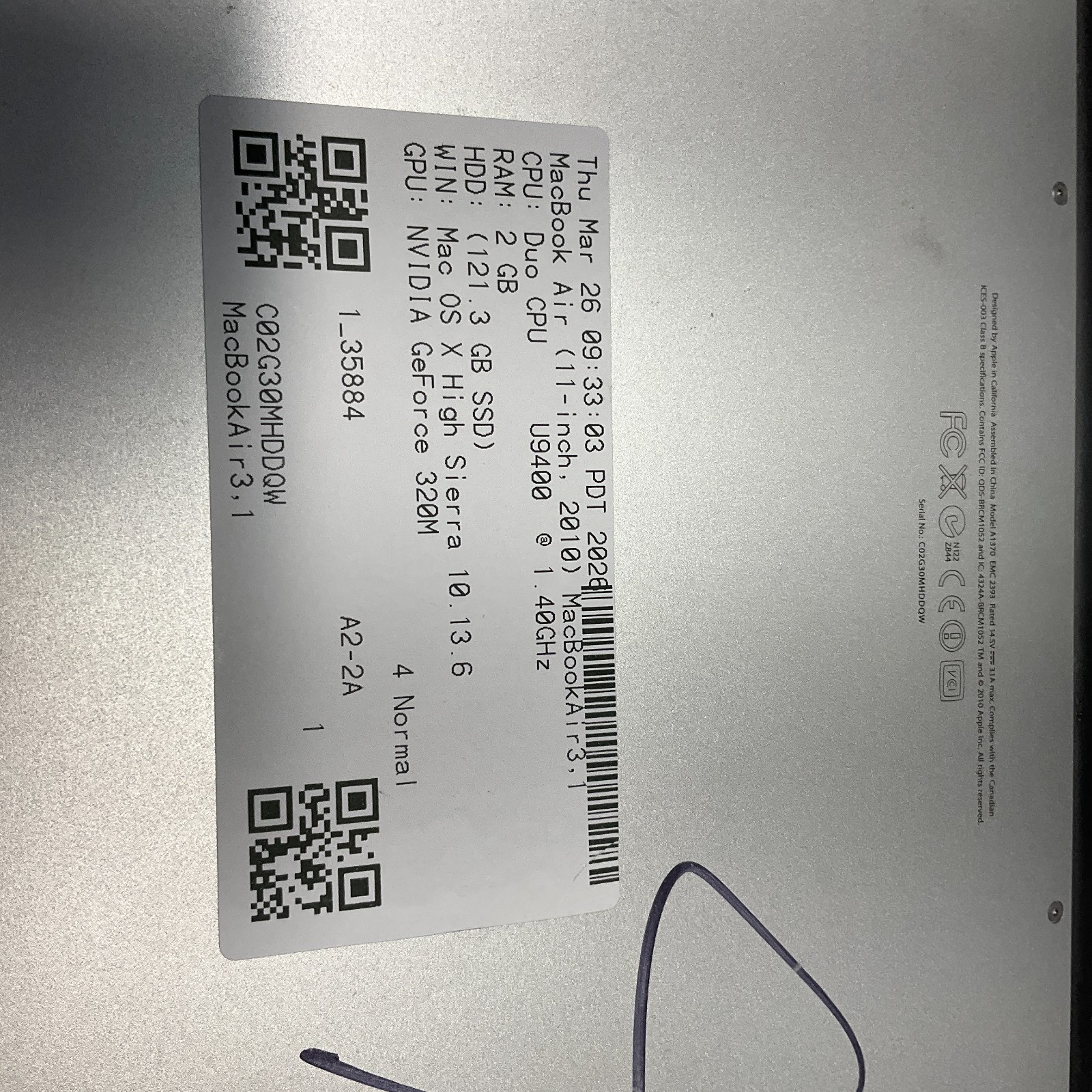 Apple MacBook Air Late 2010 11 Inch 1.4GHz 2GB 128GB macOS High Sierra 10.13.6