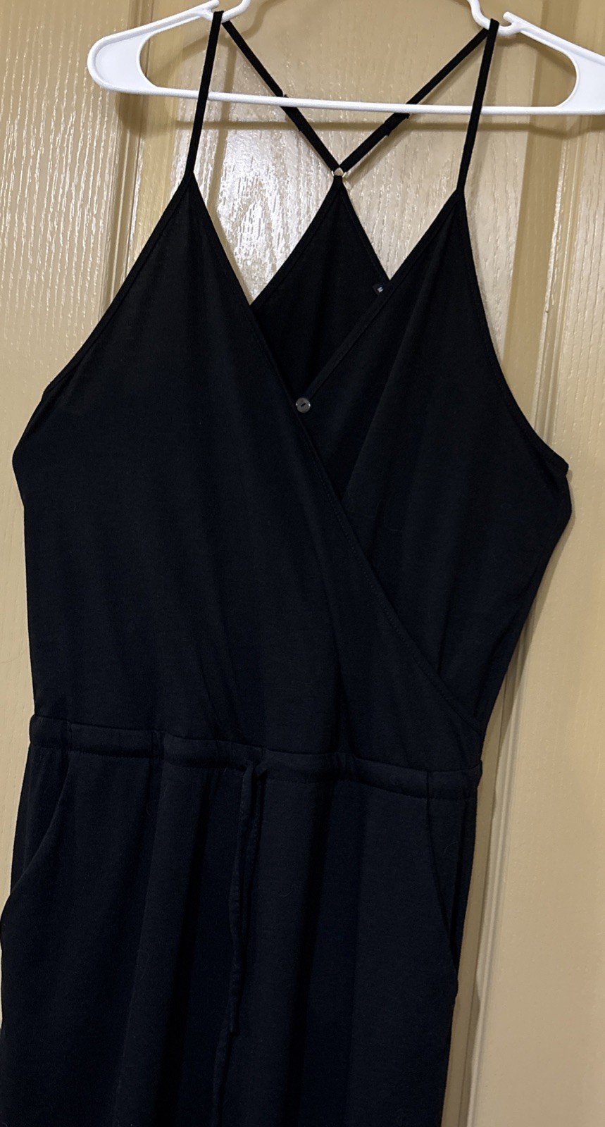 как выглядит Black Sleeveless V-Neck Jumpsuit, Spaghetti Straps, Drawstring Waist, 2 Pockets. фото