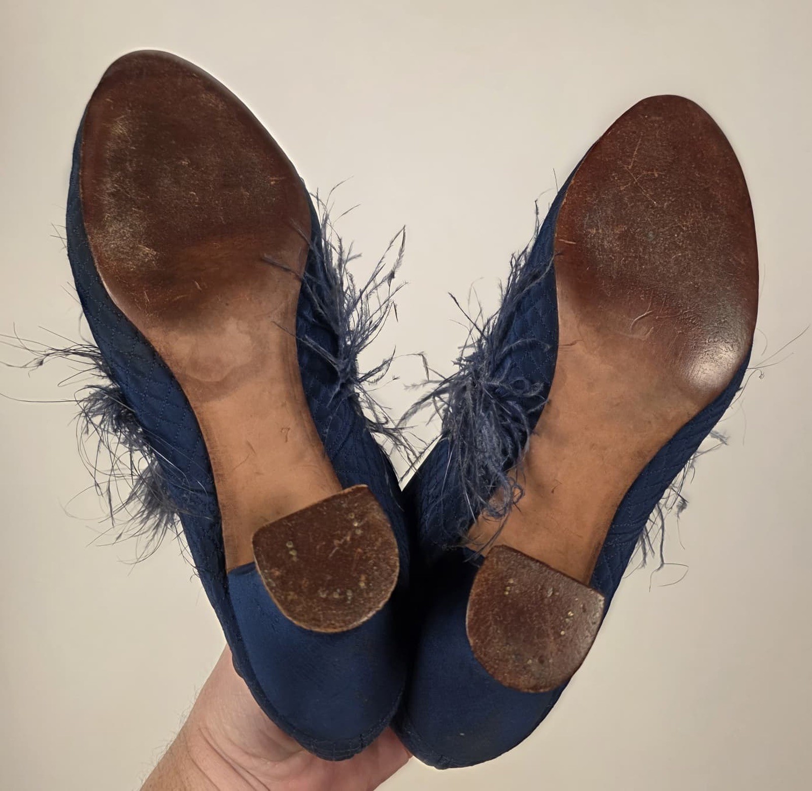 как выглядит ANTIQUE 1930 S QUILTED HIGH HEEL BOUDOIR SHOES W FEATHER TRIMMED VAMP фото