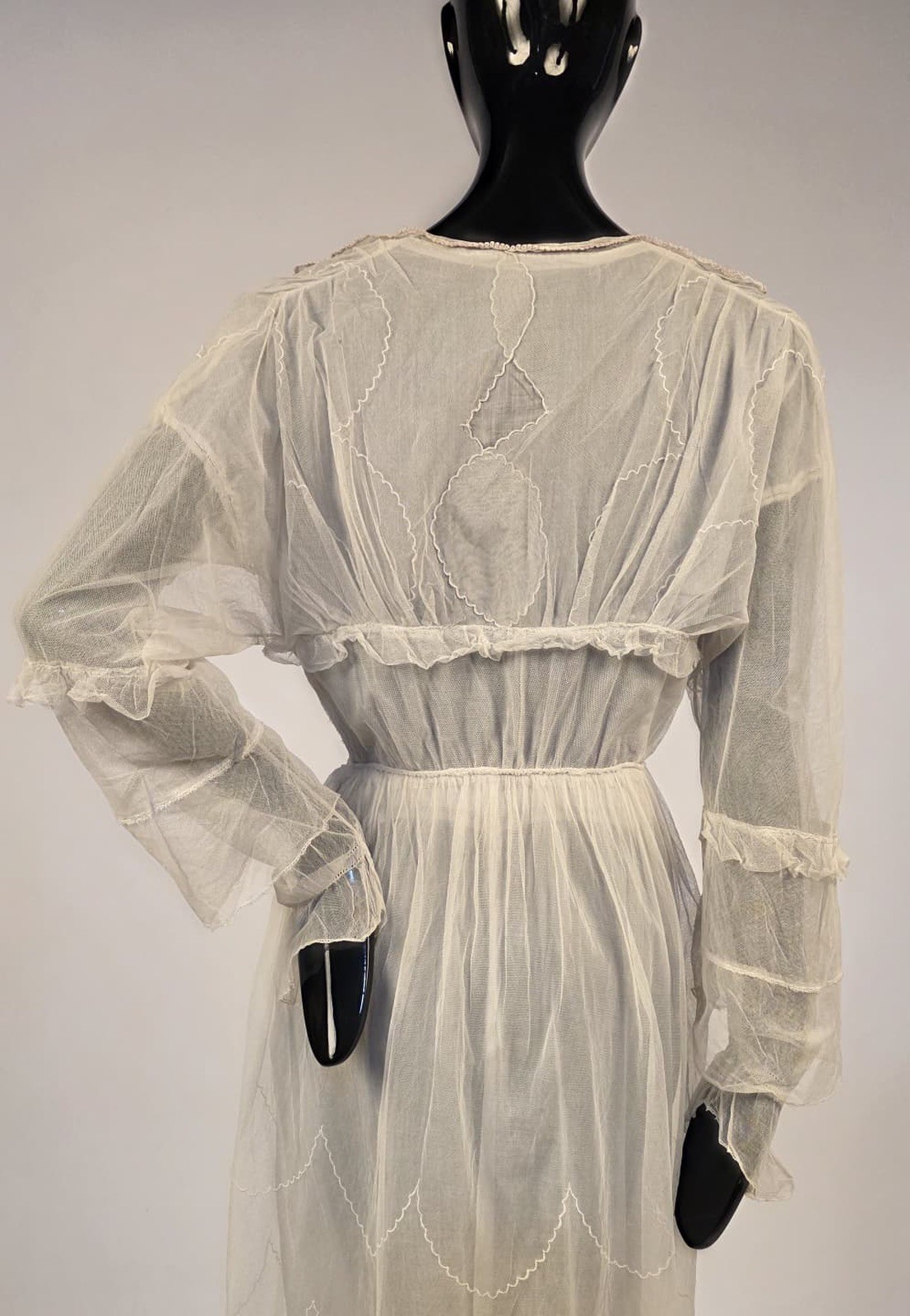 EDWARDIAN EMBROIDERED NET DRESS W SCALLOPED DETAIL VALENCIENNES LACE TRIM