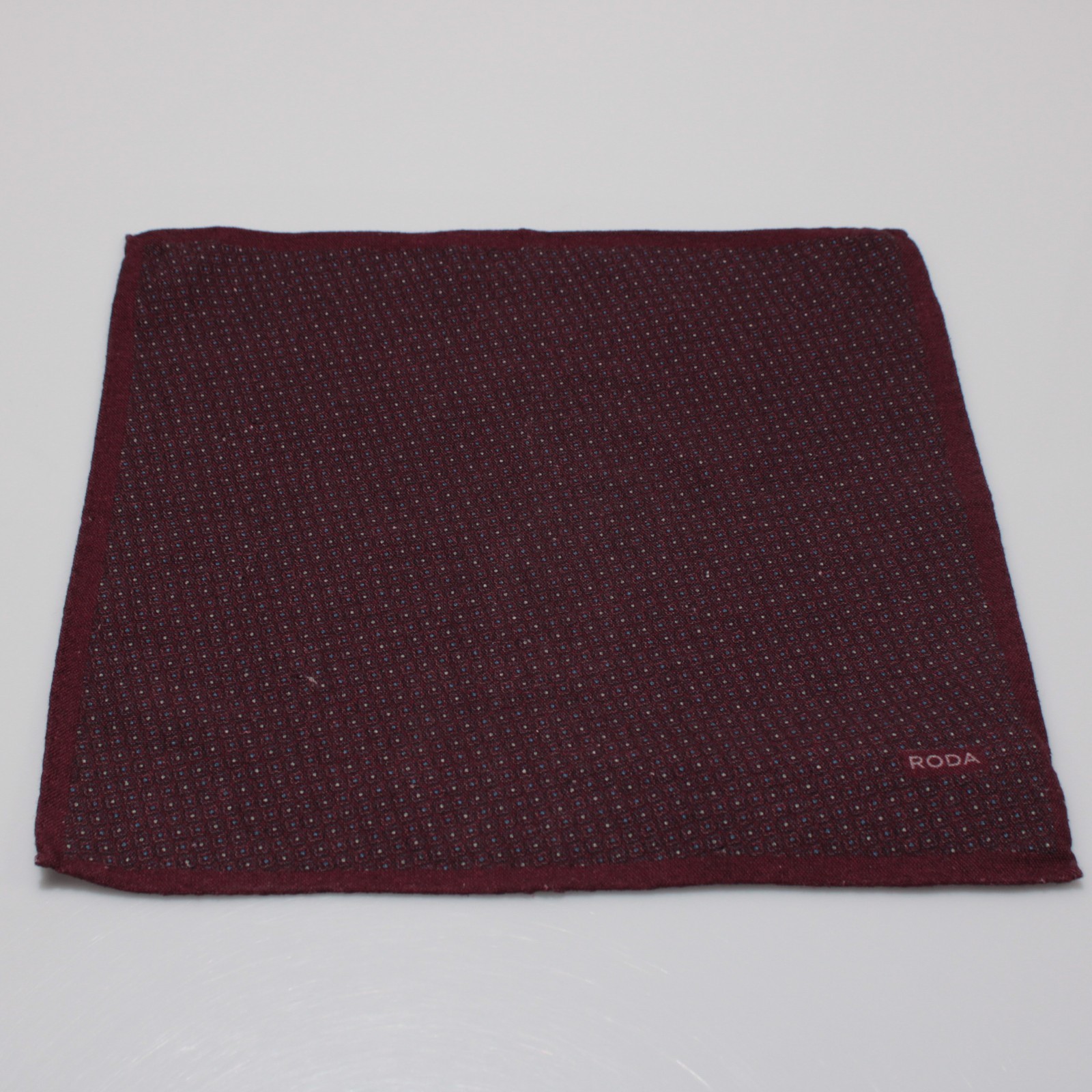 Roda NWD Wool / Silk Blend Pocket Square In Red w/ Blue White Geometric Print