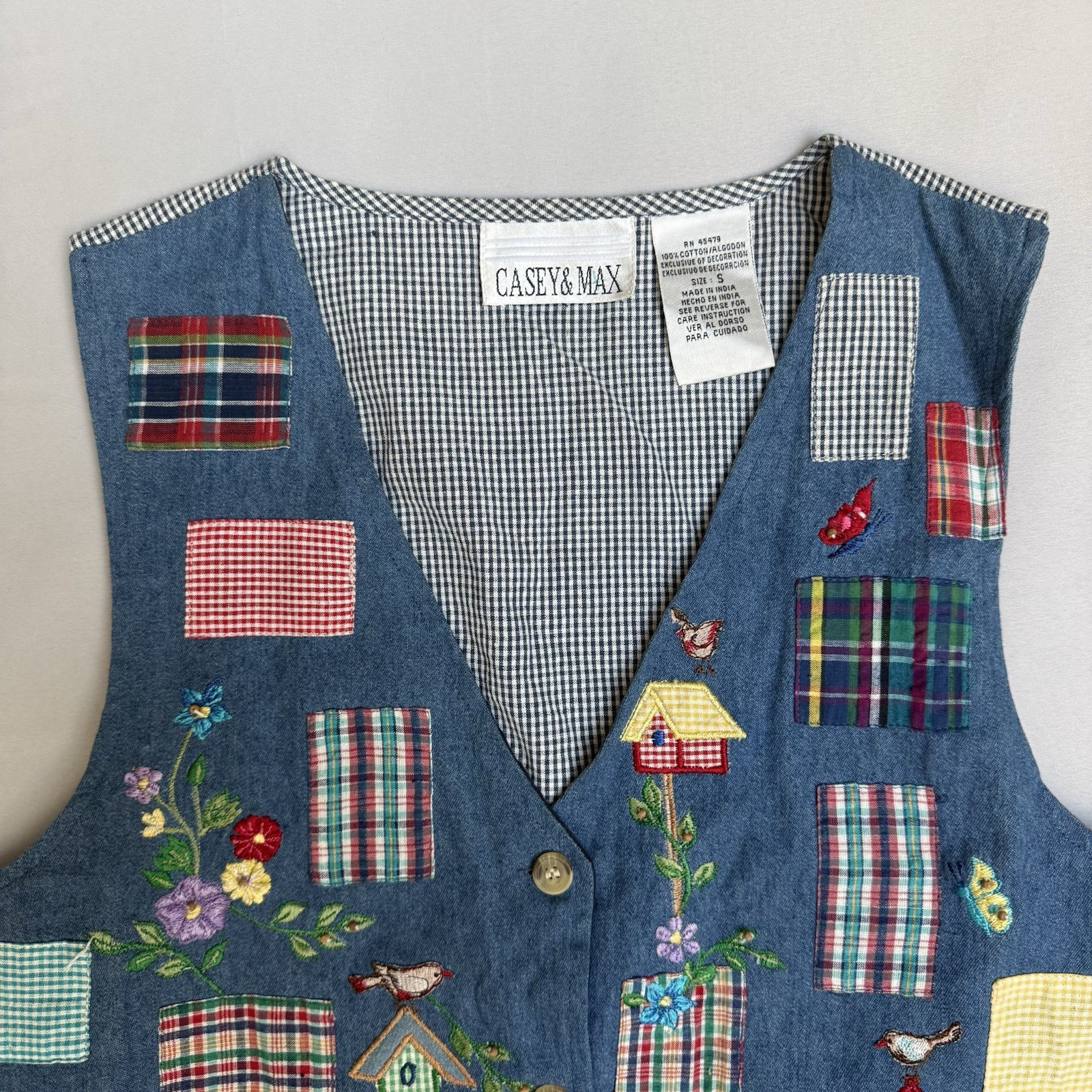 CASEY MAX Vintage Blue Multicolor Patchwork Embroidered Cotton Vest Size S