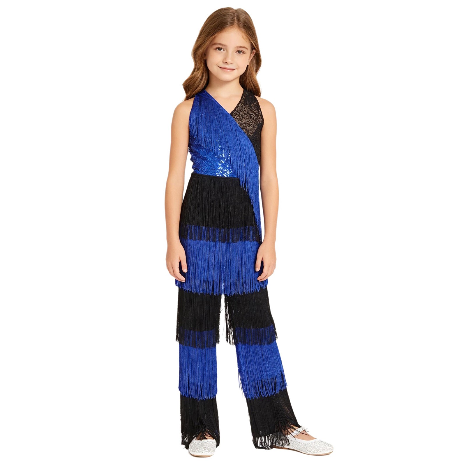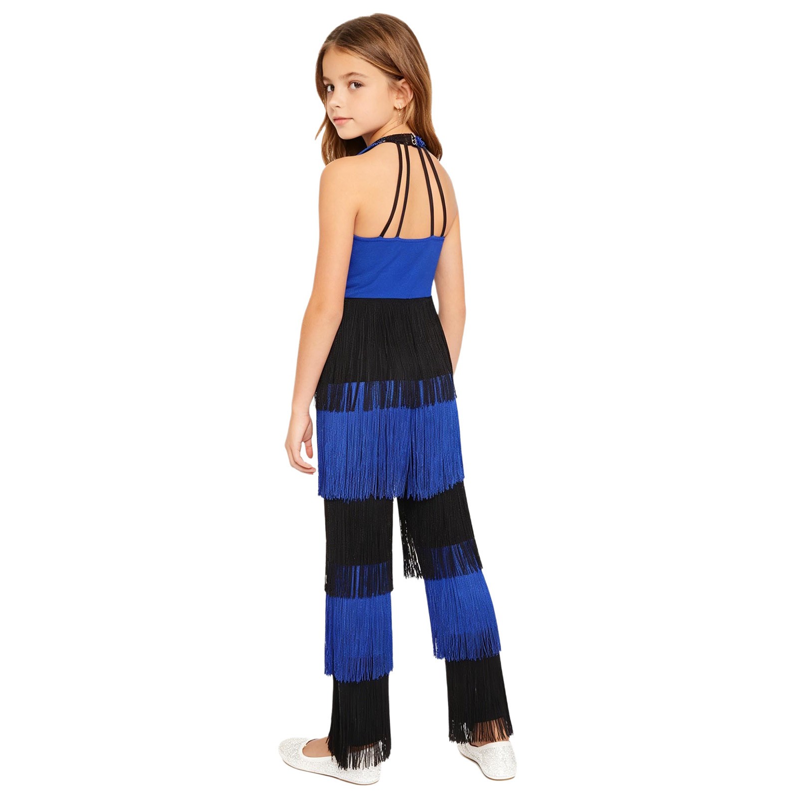 Girls Jumpsuit Latin Dancewear Sequins Bodysuit Halter Event Competition Jazz
