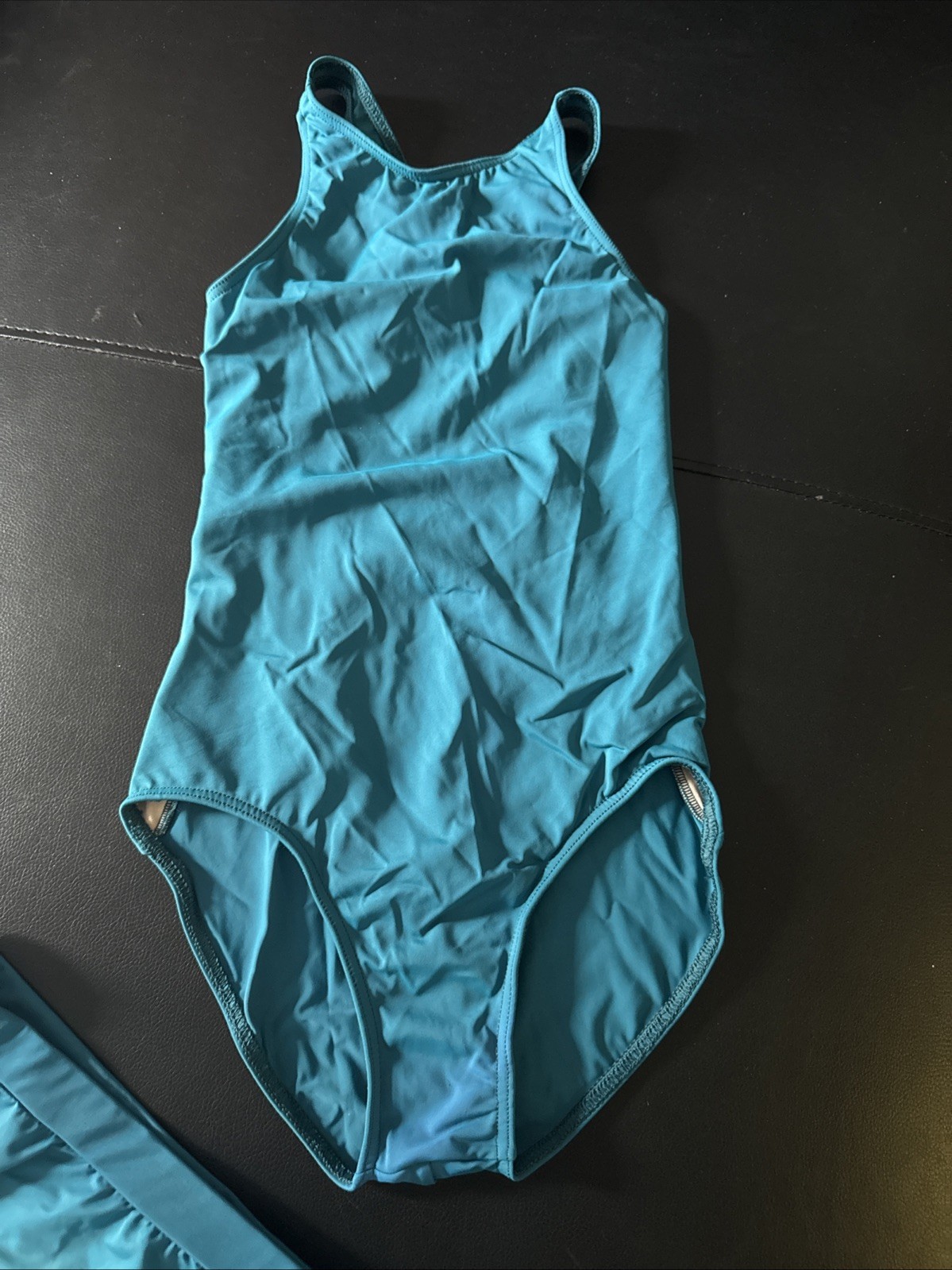 как выглядит Balera LC 2 Piece Aqua Blue Leotard Slit Pull-Up Waist Skirt Dance Dress фото