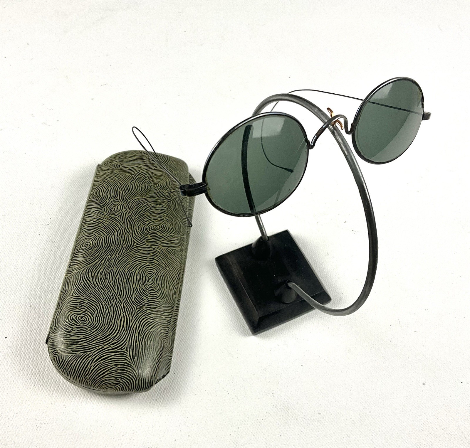 Vintage Round Green Lens Sunglasses Wire Frame Steampunk Spectacles w Case
