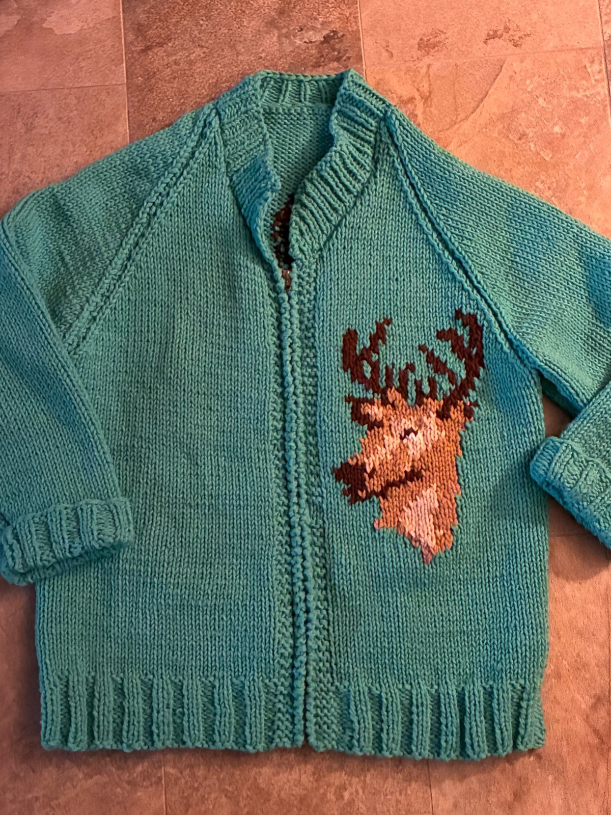 как выглядит Vtg 60s Hand Knit RARE Green Deer Cowichan Full Zip Sweater Mary Maxim Design фото