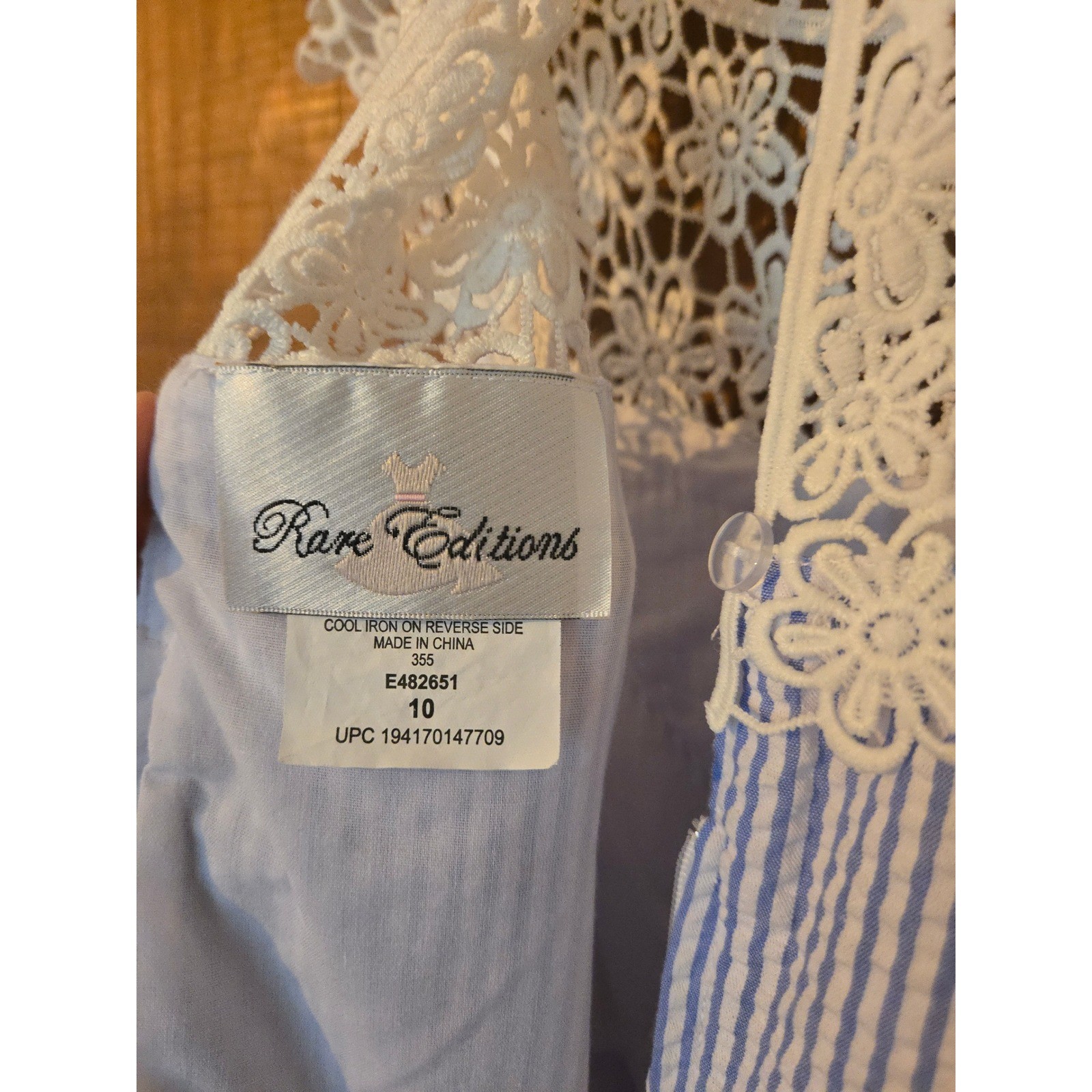 RARE EDITIONS Girls Blue White Seersucker Floral Lace Dress Size 10