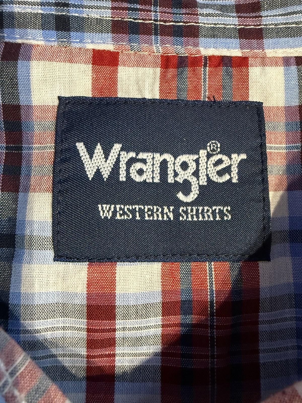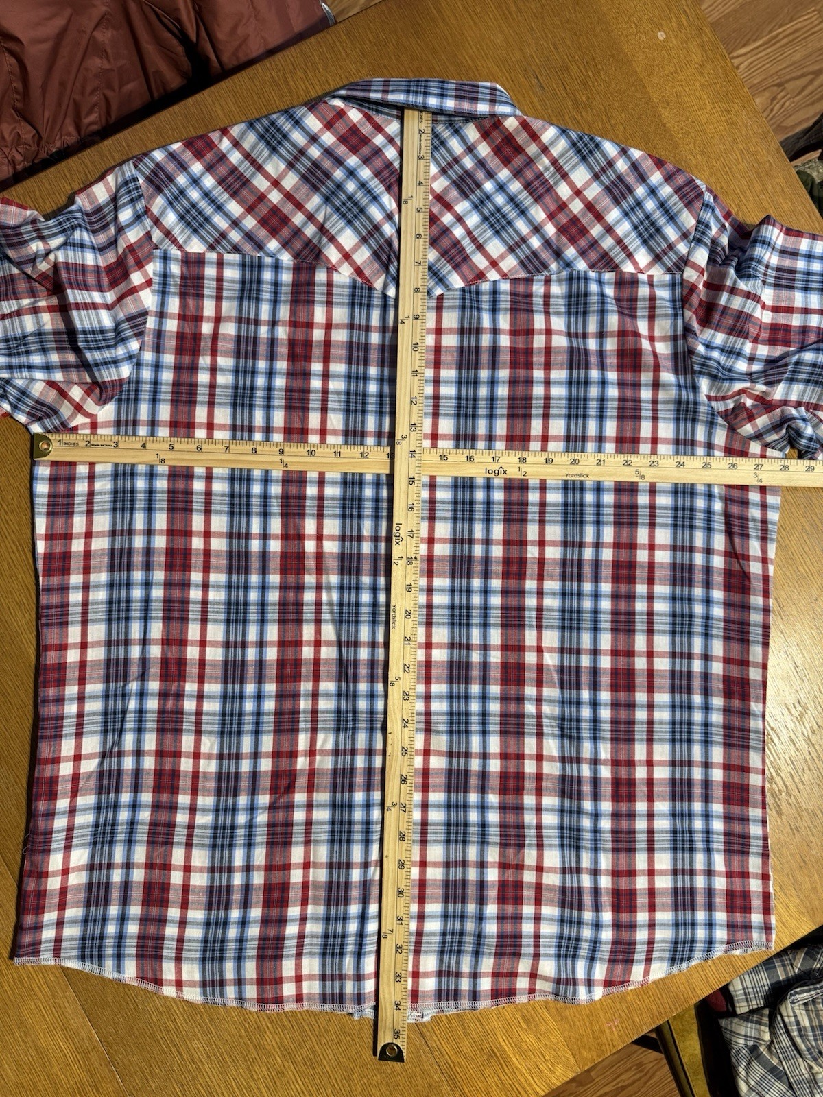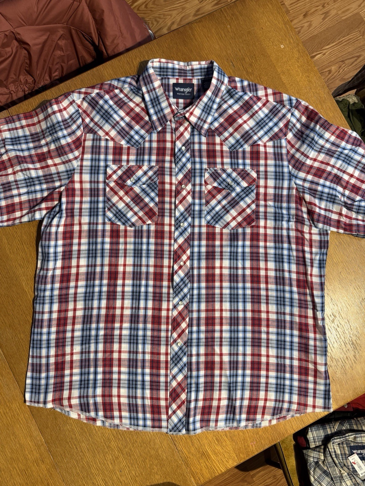 как выглядит Wrangler Western Snap Shirt Men XXL Red Blue Plaid Pearl Snaps Short Sleeve фото