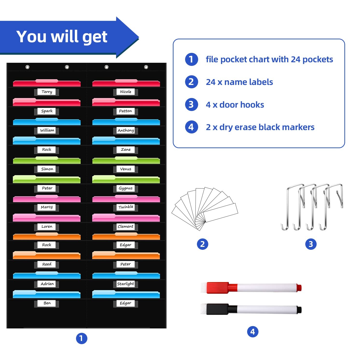 Black 24 Pockets File Storage Pocket Chart Hanging Wall Organizer Nametags