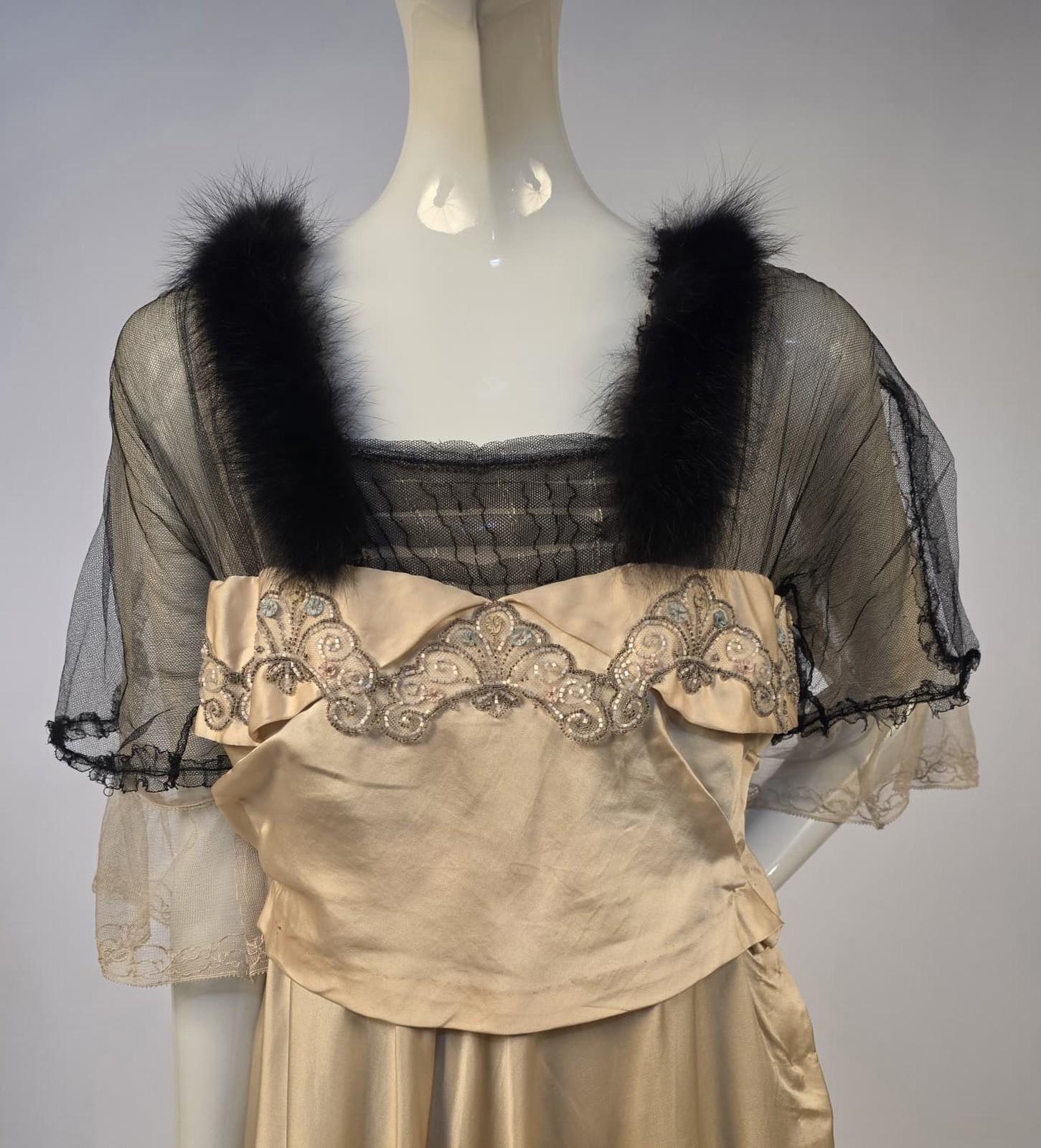EDWARDIAN YELLOW SILK EVENING DRESS W BEAUTIFUL BEADING REAL FUR TRIM