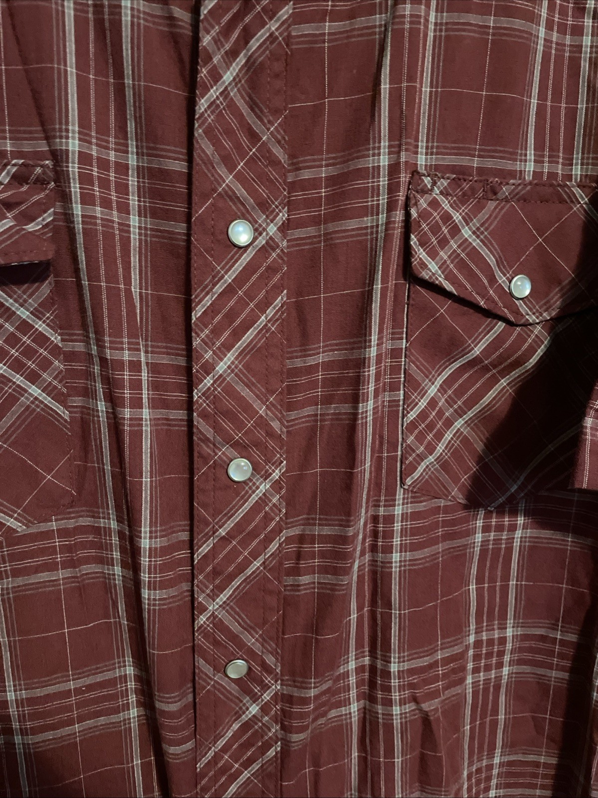 как выглядит Wrangler Western Shirt Mens Size XXL Pearl Snap Maroon Red Plaid Short Sleeved фото