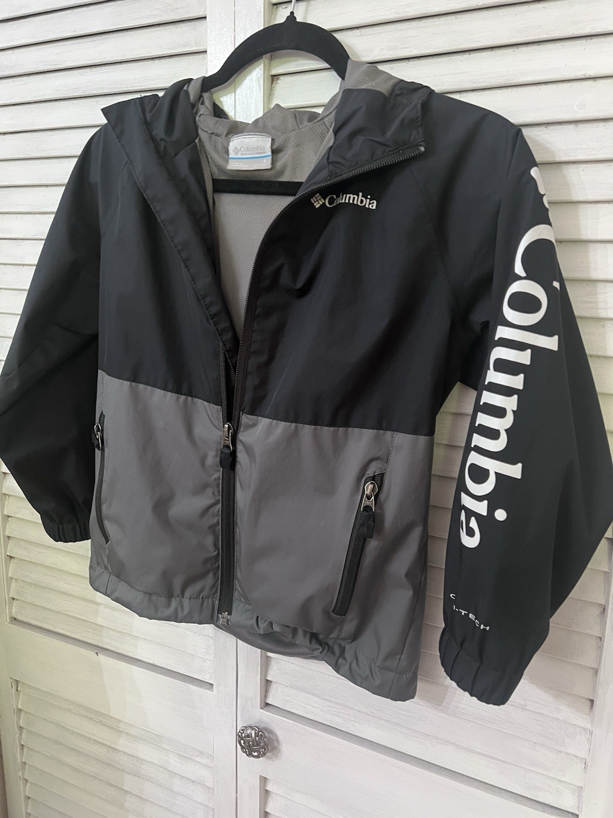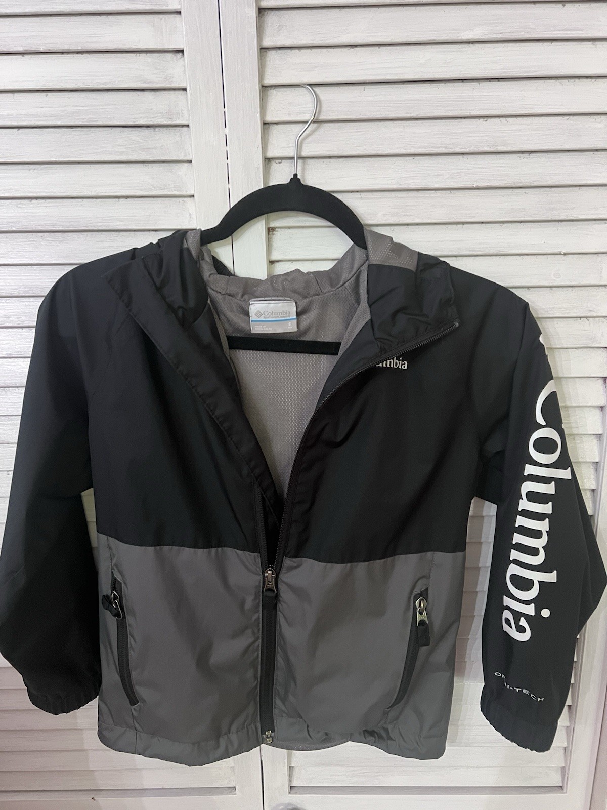 Columbia Omni-Tech Youth Hooded Rain Jacket Windbreaker Black Gray Sz. Youth S/8