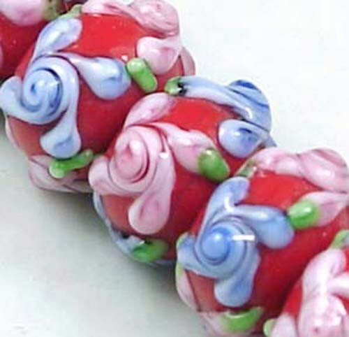 8 Handmade Lampwork Glass Rondelle Beads Primrose Flower Pink Blue on Red