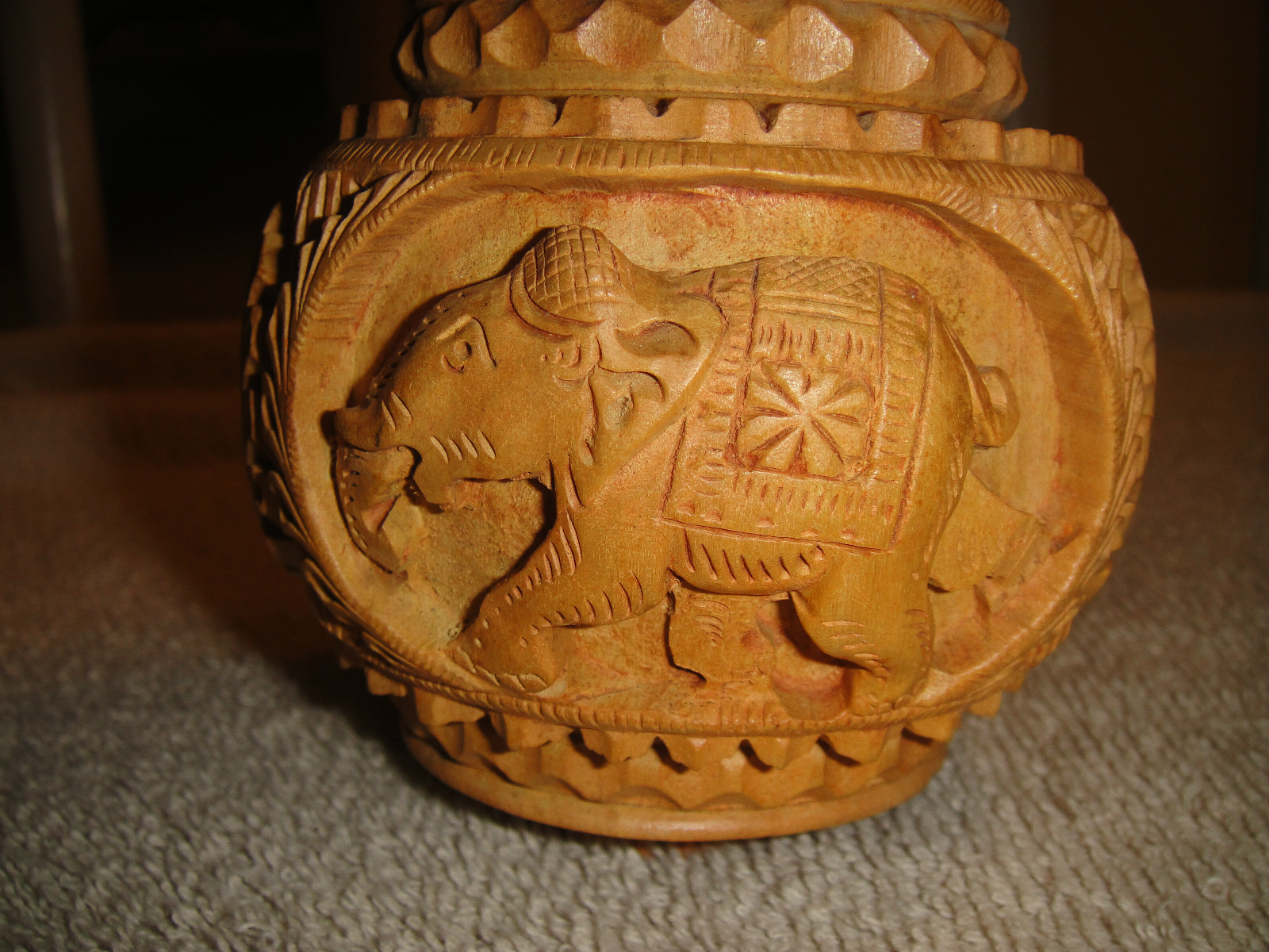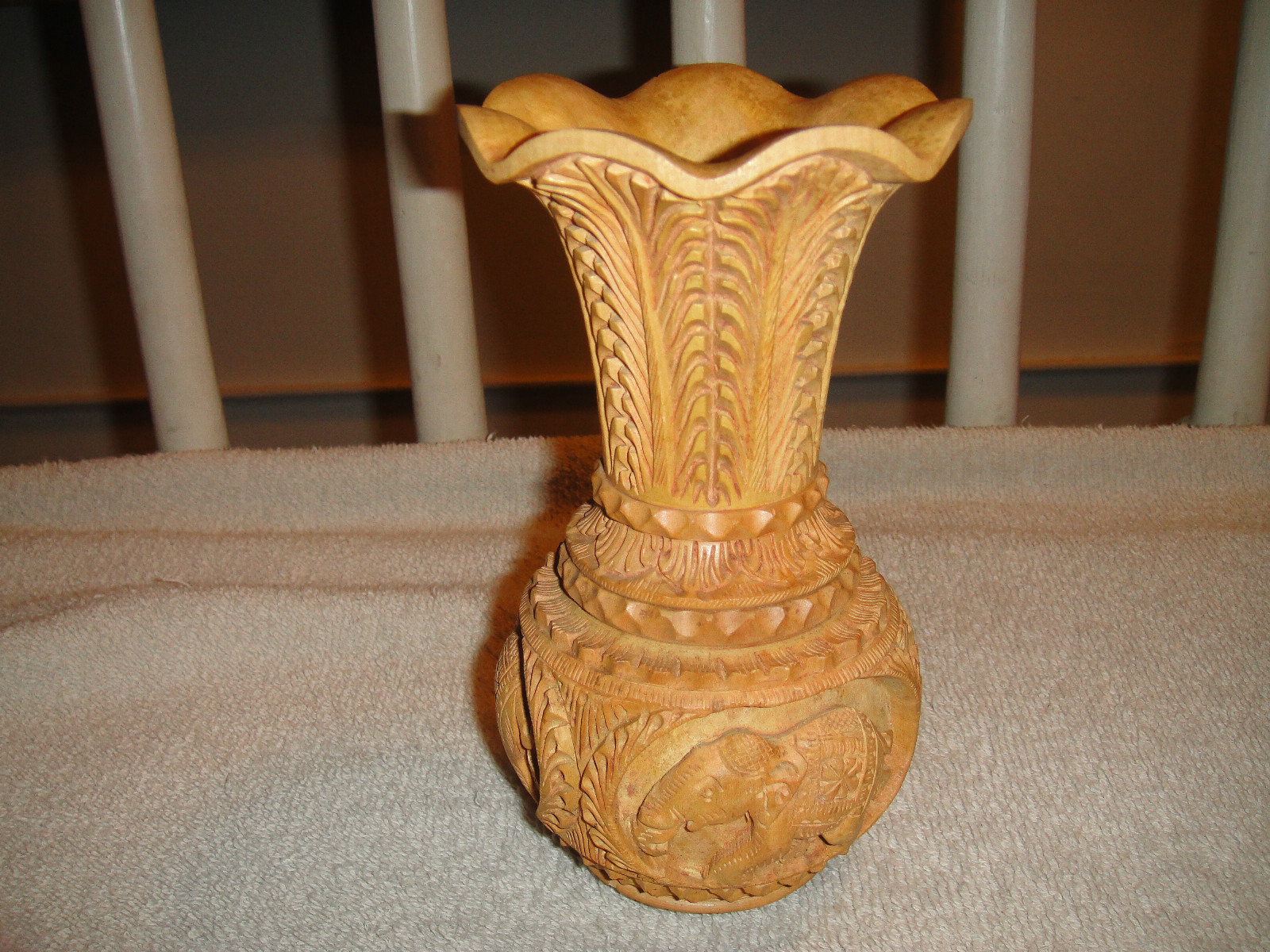 как выглядит Vintage Elephant Wood Carved Vase-Great Elephant Detailing-Open Bottom-Ruffled фото