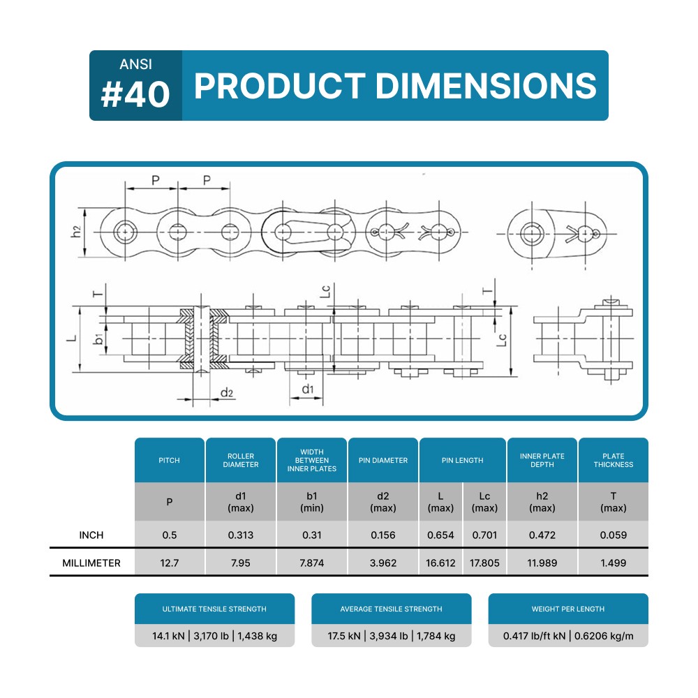 40 Roller Chain x 10 feet 2 Connecting Links Same Day Expedited Shipping