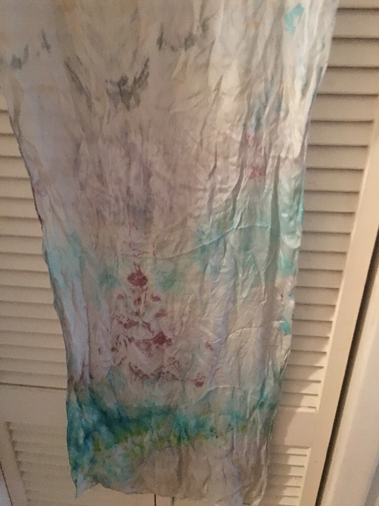 VINTAGE GLENTEX HAND ROLLED SILK SCARF 46 x 16 SPLASHES OF GREEN BROWN