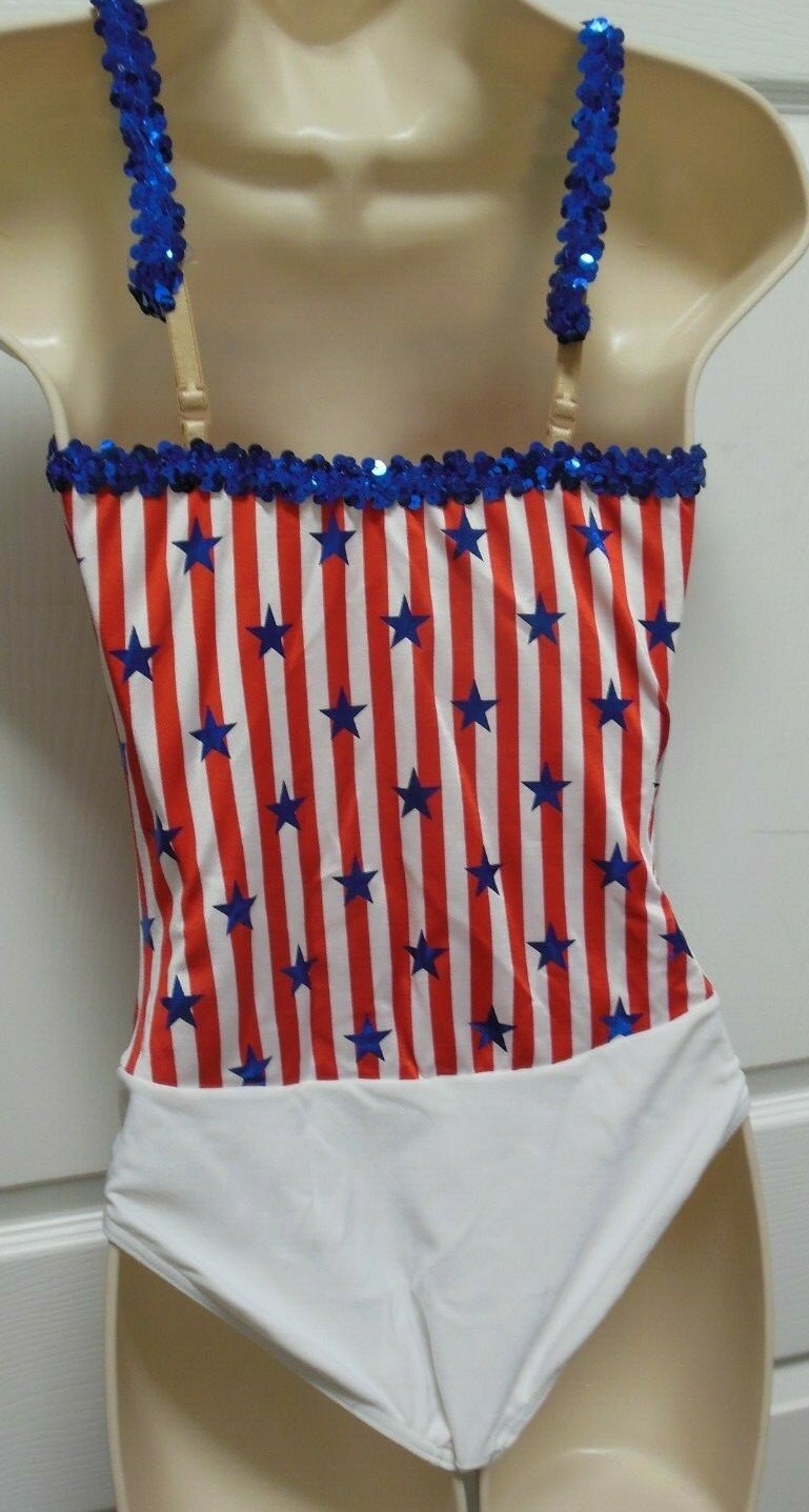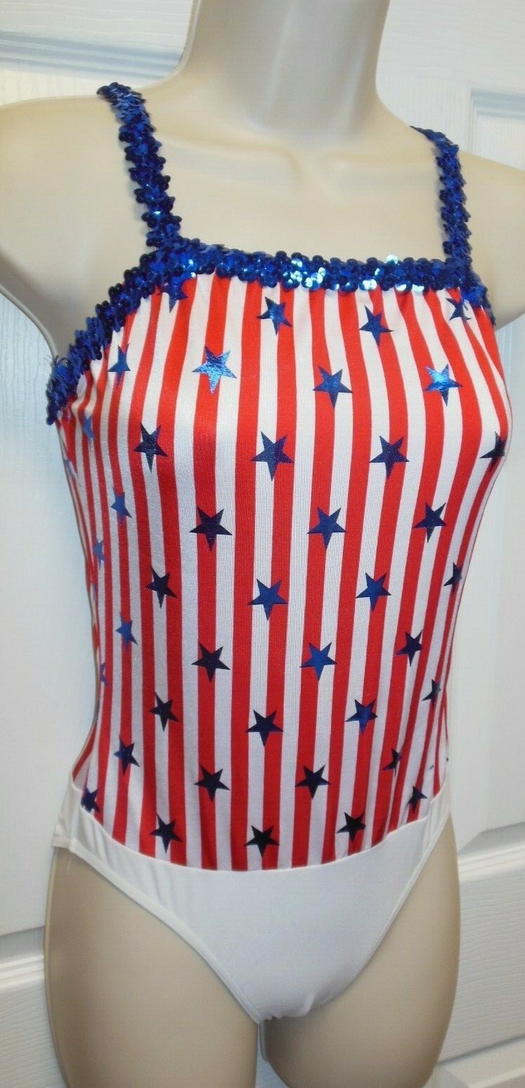как выглядит Patriotic Dance costume leotard Blue Foil stars Red white striped field XLchild фото