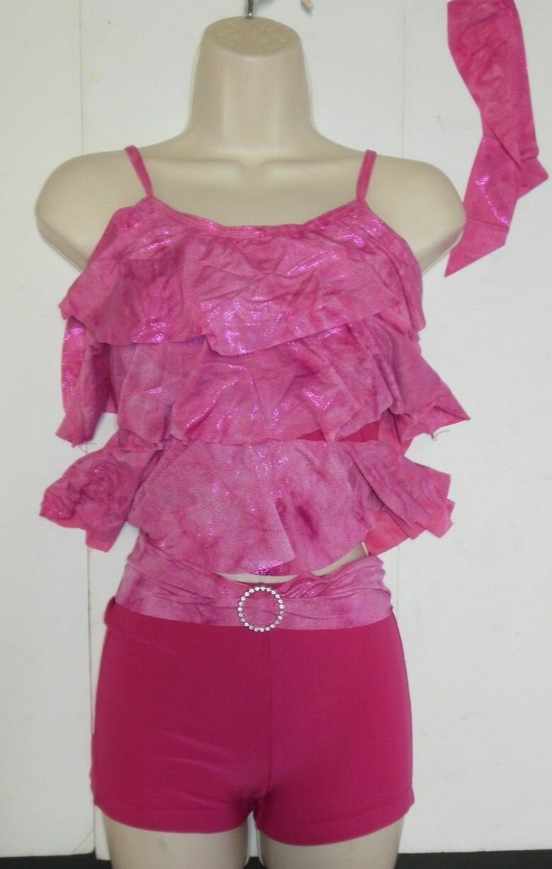 JAZZ DANCE COSTUME Rasberry FOIL Ruffles LADIES Szs top shorts BELT 3 pieces