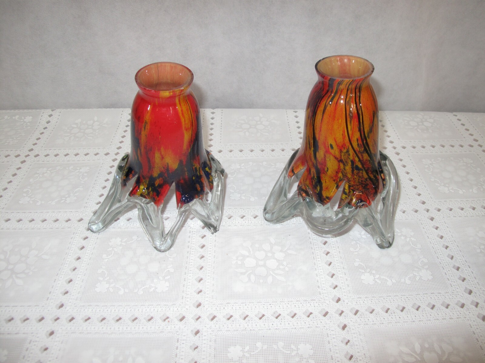 PAIR OF HAND BLOWN GLASS TULIP SHADES RED MULTI