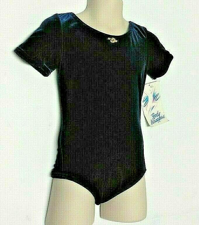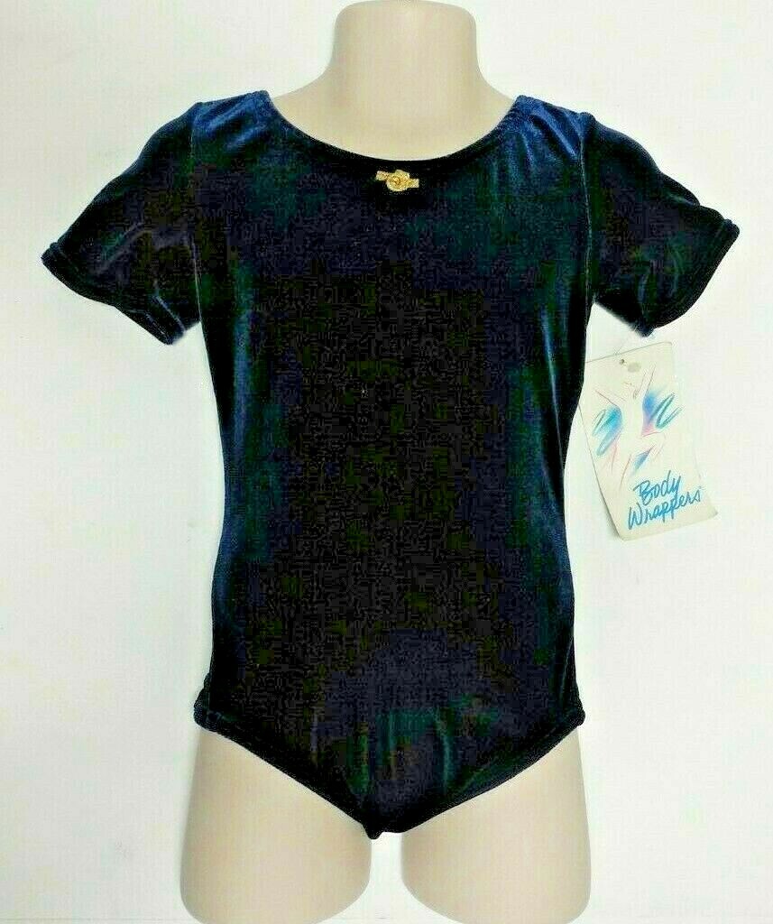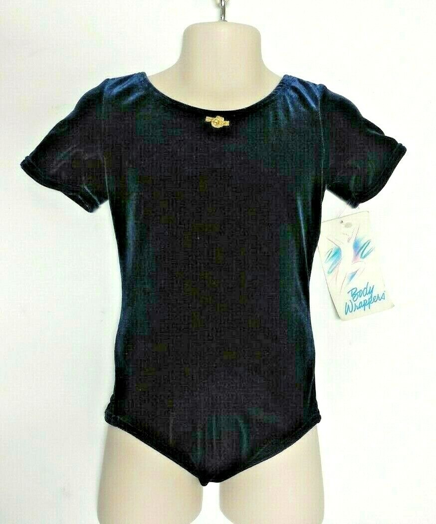 Body Wrappers NAVY BLUE Short Sleeve Velvet Leotard Gold Rosette child 4-6