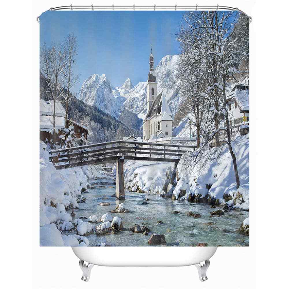 Snow Cabins And Streams 3D Shower Curtain Waterproof Fabric Bathroom Decoration