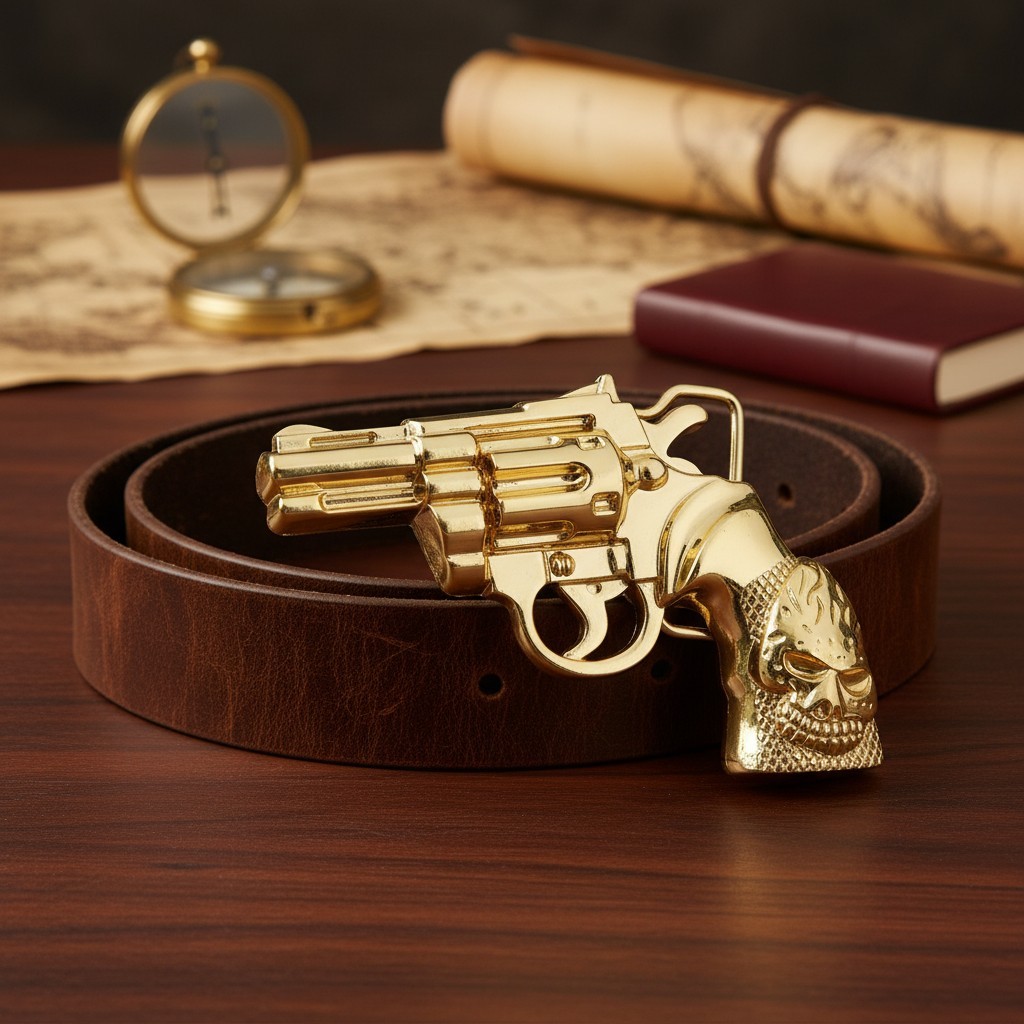 как выглядит Men Fashion Belt Buckle Gold Metal Western Pistol Revolver Gun Weapon Fire Skull фото