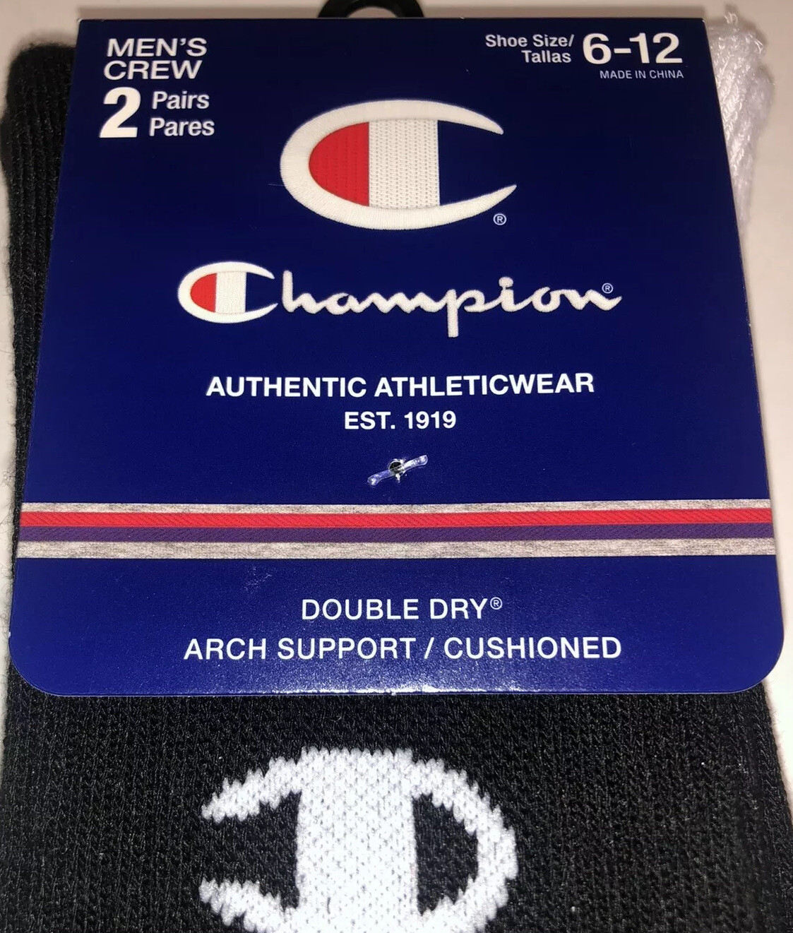 Champion Crew Sock 2 Pair Men's 6-12 Black White Red w/ Logo Cushion New 16