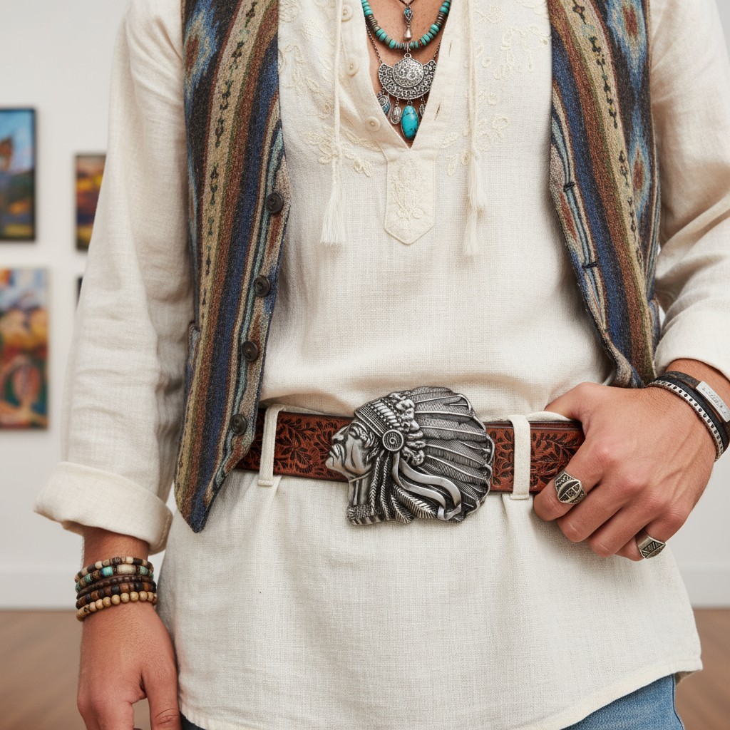 Men Dark Silver Color Metal Buckle Native American Indian Face Western Fashion