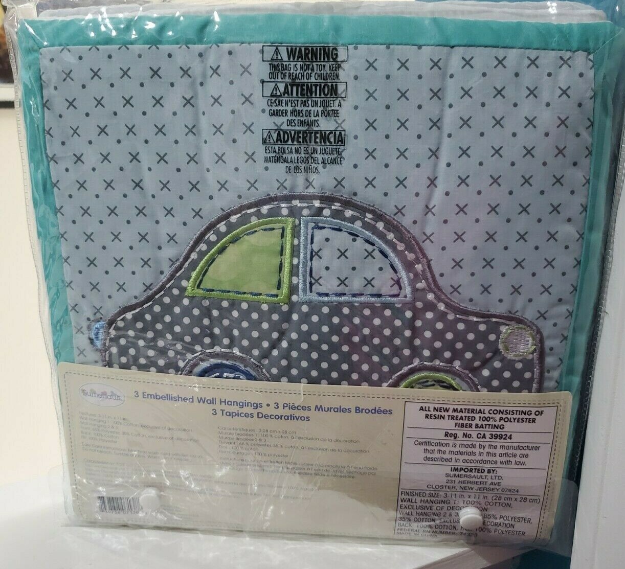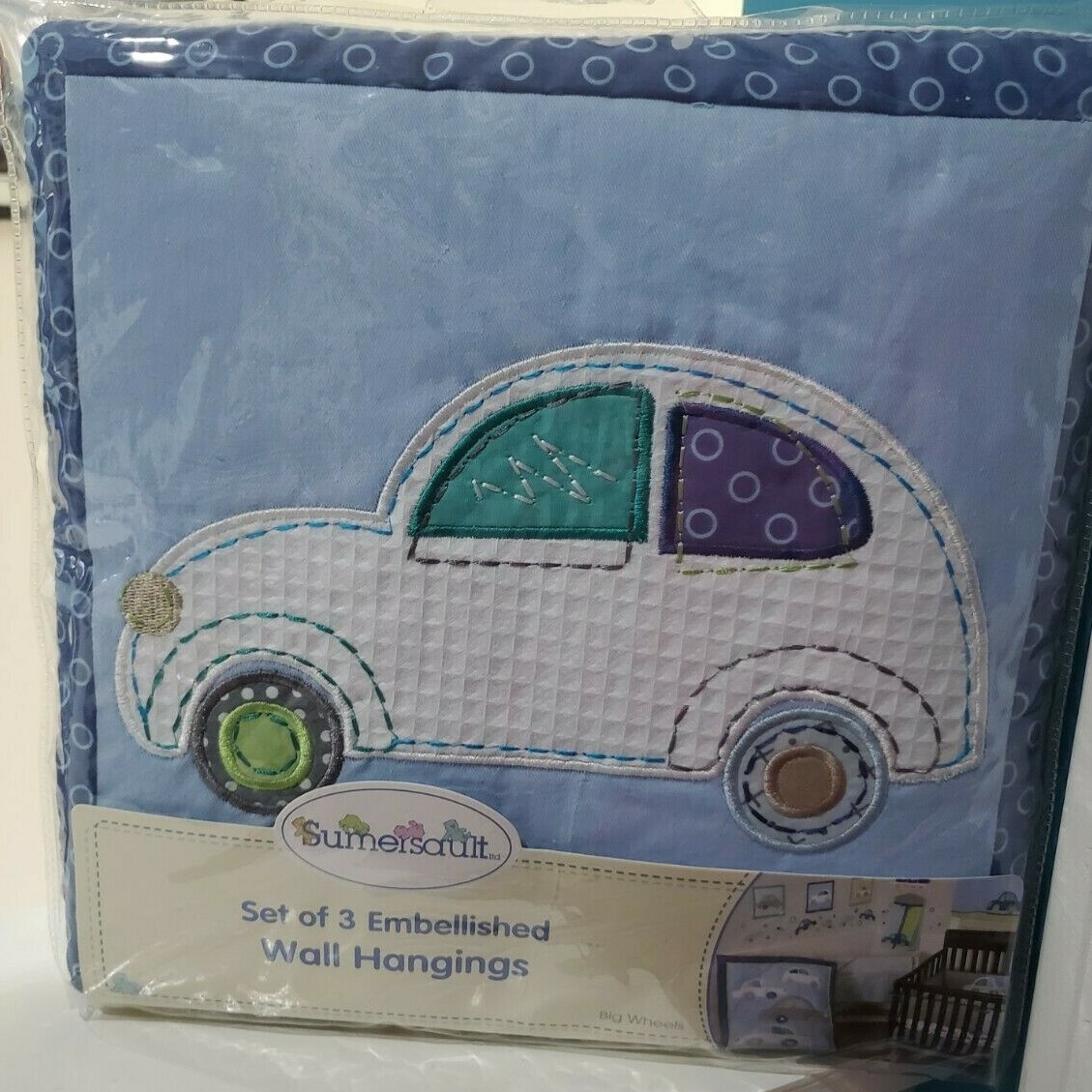 Summersault Set of 3 Baby's Nursey Embellished Wall Hangings, Big Wheels Car